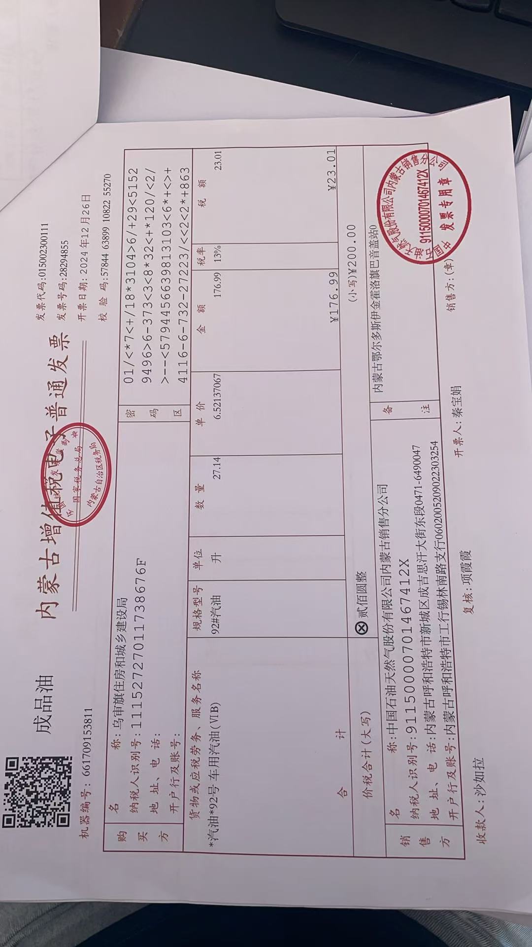 四、项目名称:蒙KUV723燃油费(2024.12.26)