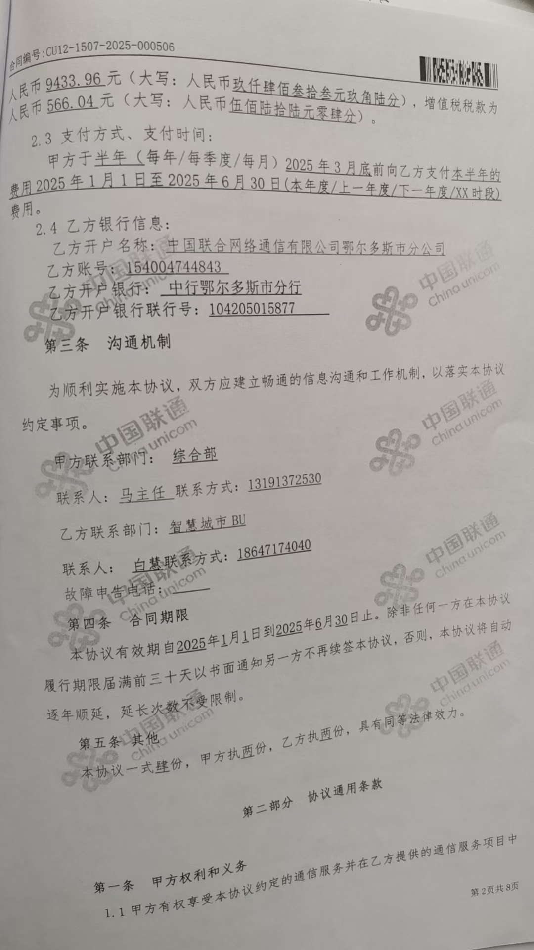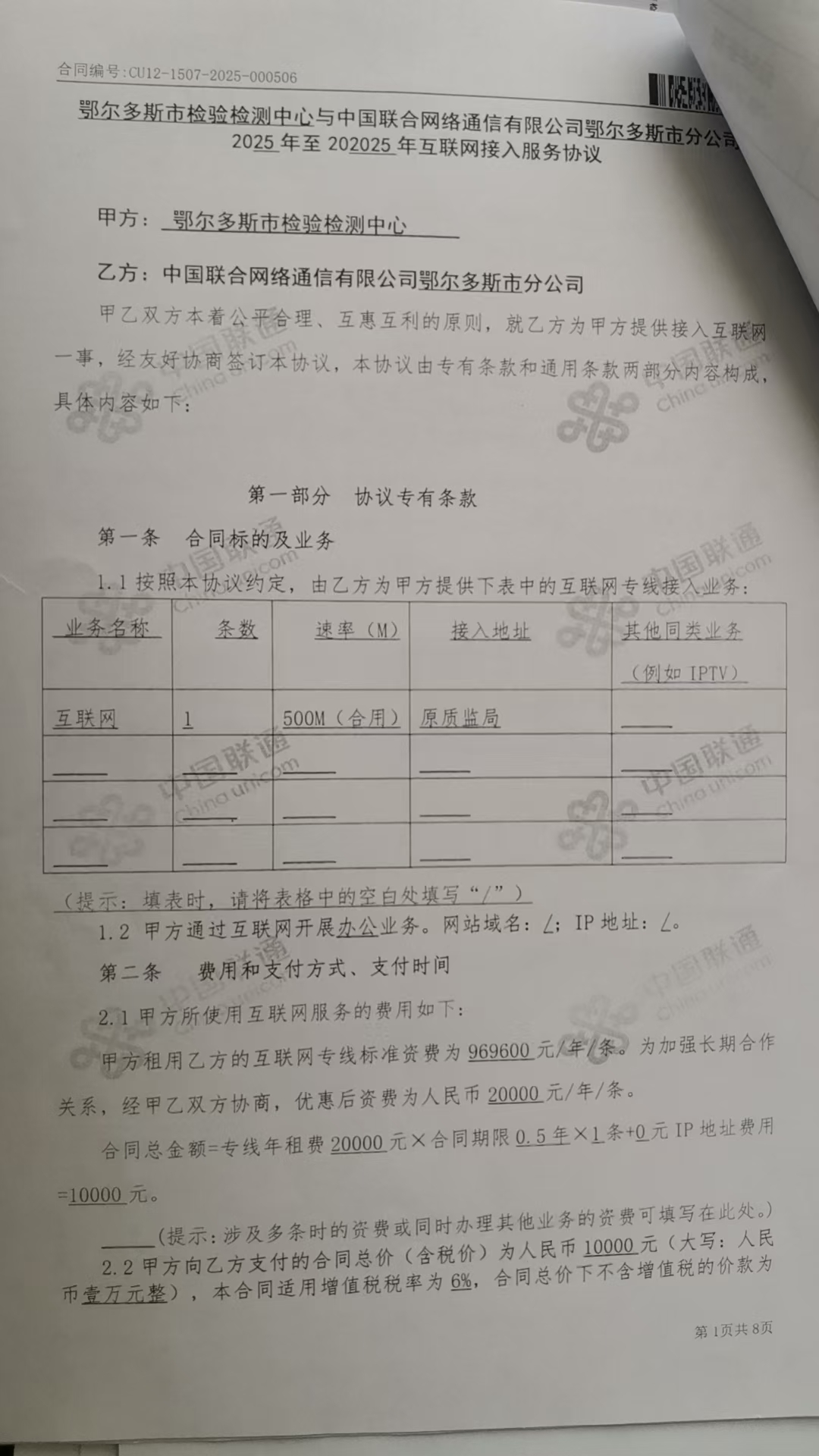 供应商(乙方):中国联合网络通信有限公司鄂尔多斯市分公司