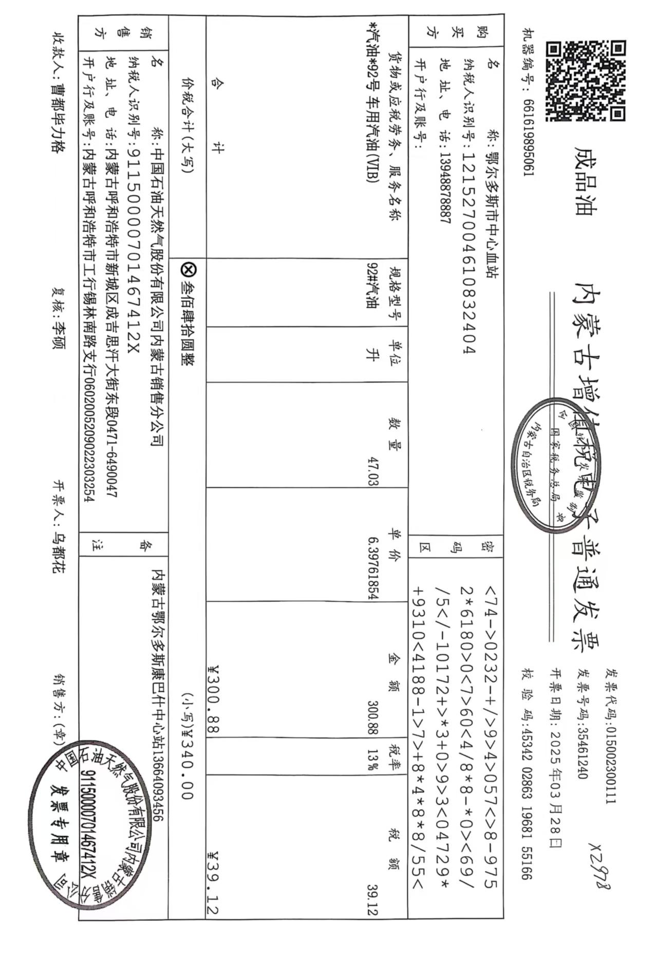 四、项目名称:鄂尔多斯市中心血站车辆三月用油用电