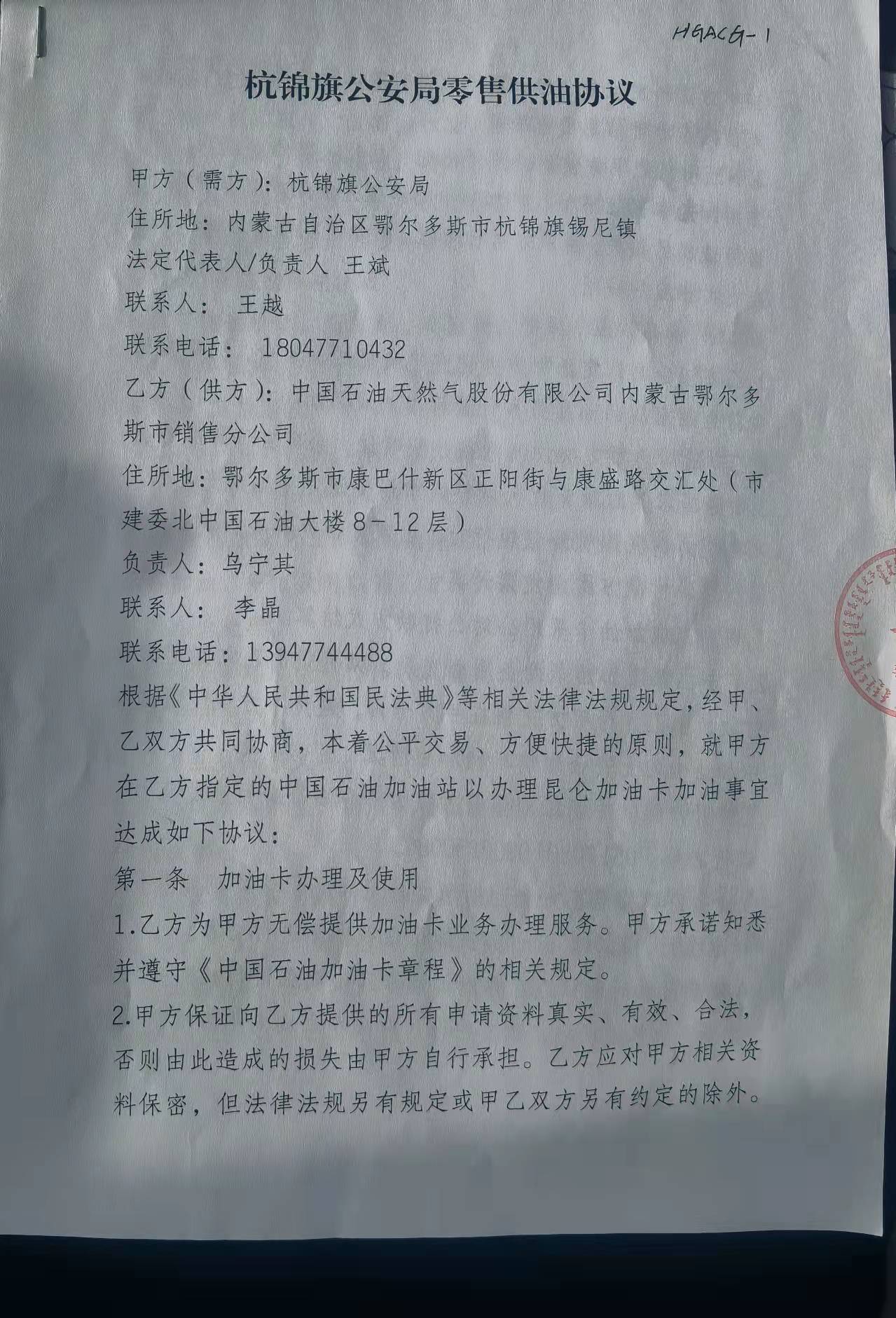 二、合同名称:杭锦旗公安局零售供油协议