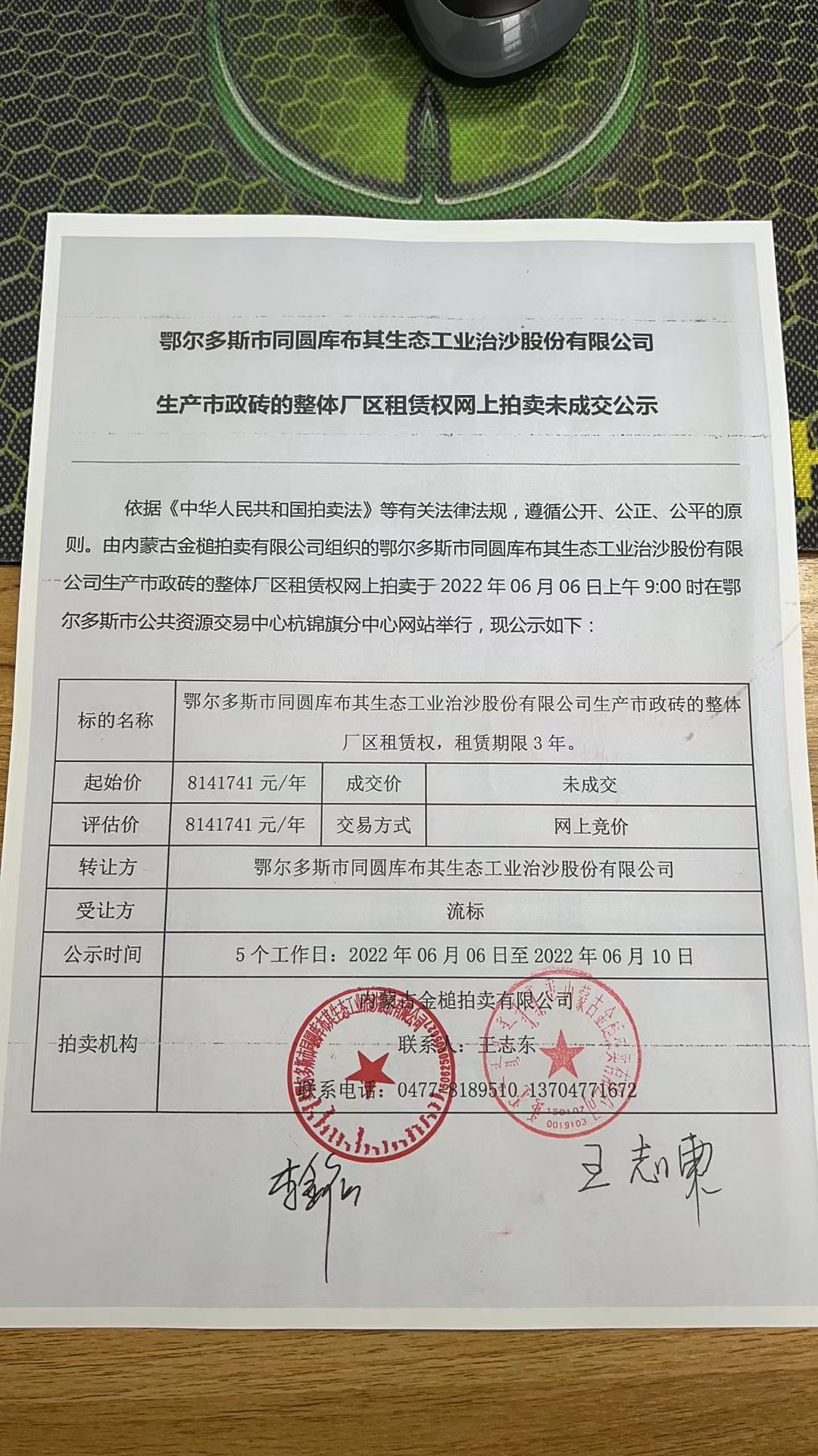 依据《中华人民共和国拍卖法》等有关法律法规,遵循公开、公正、公平的原则。由内蒙古金槌拍卖有限公司组织的鄂尔多斯市同圆库布其生态工业治沙股份有限公司生产市政砖的整体厂区租赁权网上拍卖于2022年06月06日上午9:00时在鄂尔多斯市公共资源交易中心杭锦旗分中心网站举行,现公示如下: