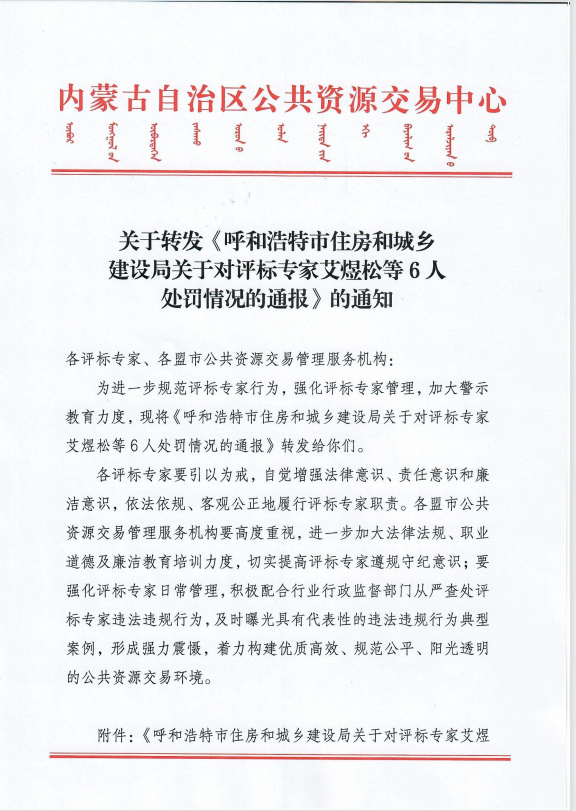 关于转发《呼和浩特市住房和城乡建设局关于对评标专家艾煜松等6人处罚情况的通报》的通知