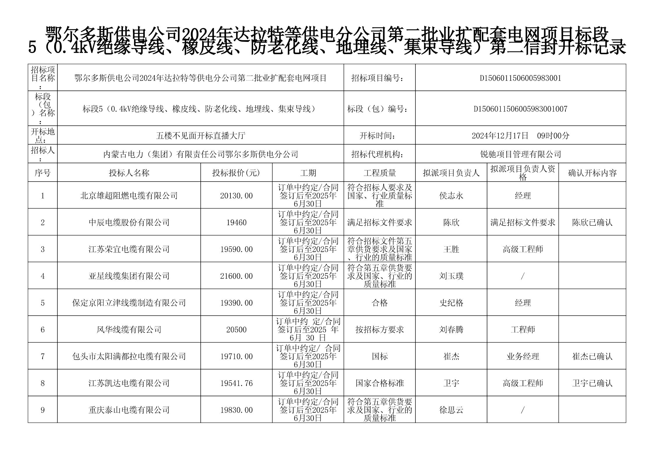 鄂尔多斯供电公司2024年达拉特等供电分公司第二批业扩配套电网项目标段5(0.4kV绝缘导线、橡皮线、防老化线、地埋线、集束导线)中标候选人公示