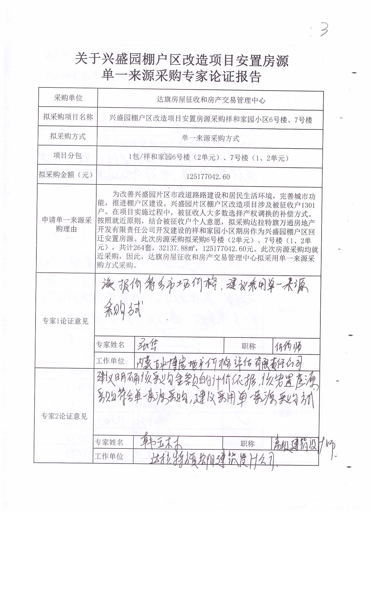 采用单一来源采购方式的原因及说明:为改善兴盛园片区市政道路路建设和居民生活环境,完善城市功能,推进棚户区建设。兴盛园片区棚户区改造项目涉及被征收户1301户。在项目实施过程中,被征收人大多数选择产权调换的补偿方式。按照就近原则,结合被征收户个人意愿,拟采购达拉特旗万通房地产开发有限责任公司开发建设的祥和家园小区期房作为兴盛园棚户区回迁安置房源。此次房源采购拟采购6号楼(2单元)、7号楼(1、2单元),共计264套,32137.88㎡,125177042.60元。此次房源采购均就近采购,并且所有采购房源都用于棚户区回迁安置房源,因此,达旗房屋征收和房产交易管理中心拟采用单一来源采购方式采购。