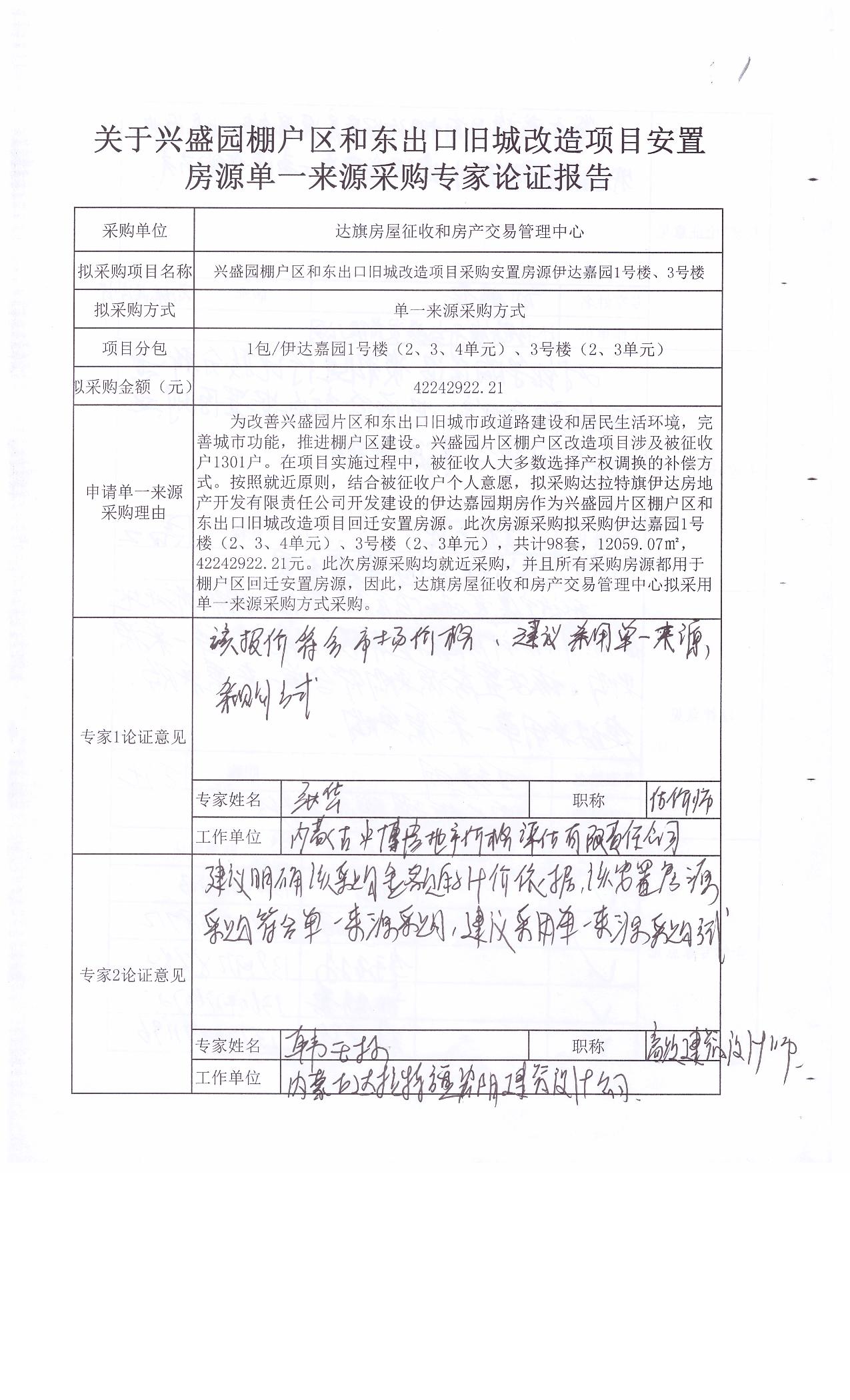 采用单一来源采购方式的原因及说明:为改善兴盛园片区和东出口旧城市政道路建设和居民生活环境,完善城市功能,推进棚户区建设。兴盛园片区棚户区改造项目涉及被征收户1301户。在项目实施过程中,被征收人大多数选择产权调换的补偿方式。按照就近原则,结合被征收户个人意愿,拟采购达拉特旗伊达房地产开发有限责任公司开发建设的伊达嘉园期房作为兴盛园片区和三顷地片区棚户区回迁安置房源。此次房源采购拟采购伊达嘉园1号楼(2、3、4单元)、3号楼(2、3单元),共计98套,12059.07㎡,42242922.21元。此次房源采购均就近采购,并且所有采购房源都用于棚户区回迁安置房源,因此,达旗房屋征收和房产交易管理中心拟采用单一来源采购方式采购。