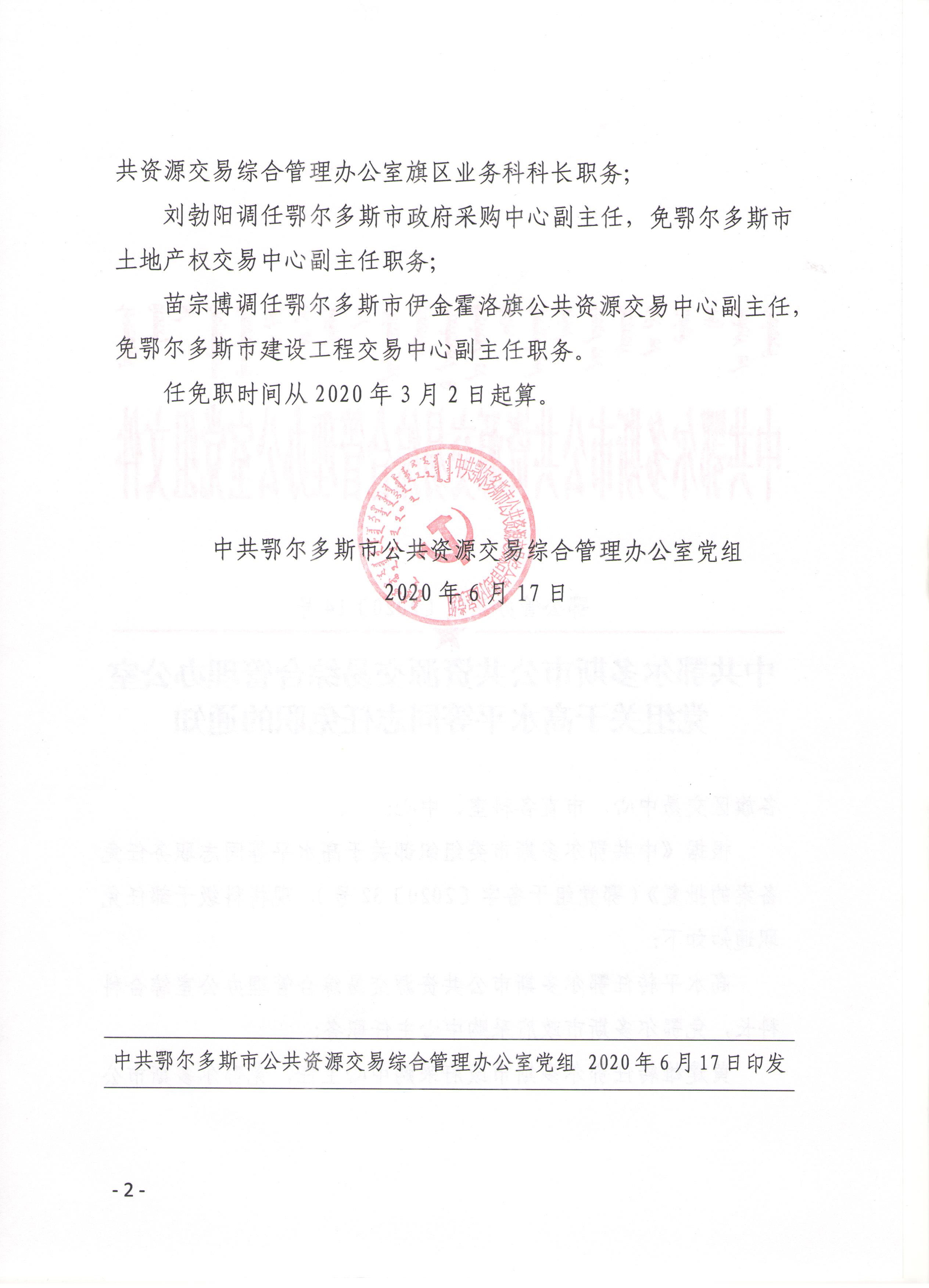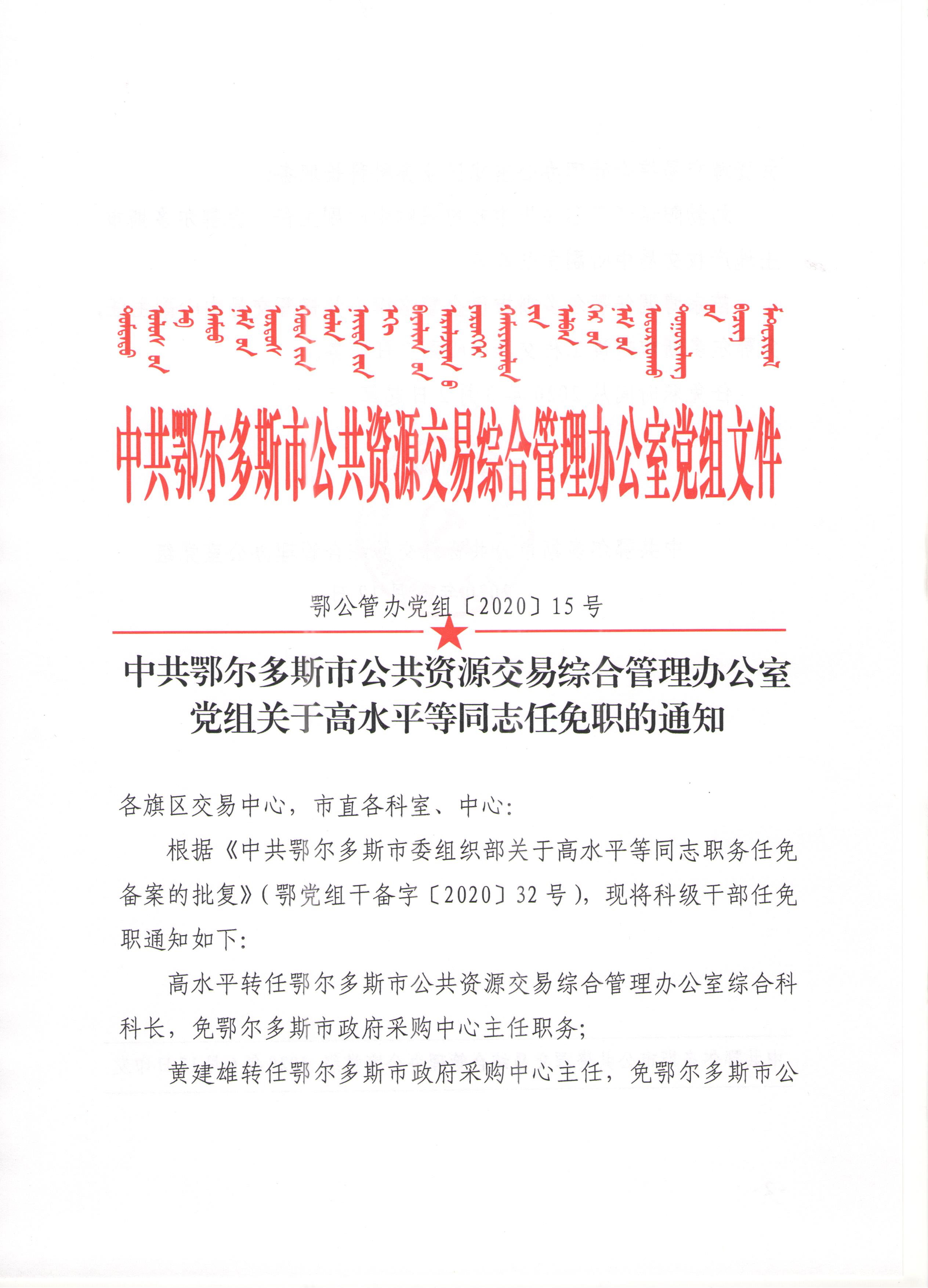 中共鄂尔多斯市公共资源交易综合管理办公室党组关于高水平等同志任免职的通知
