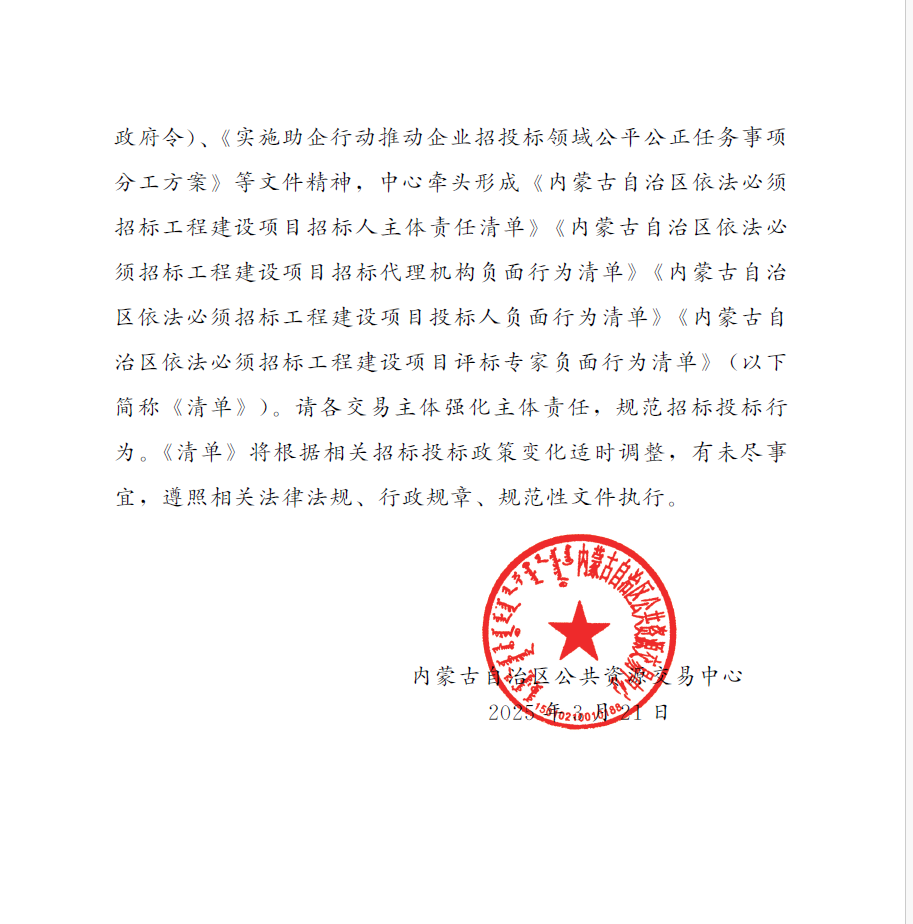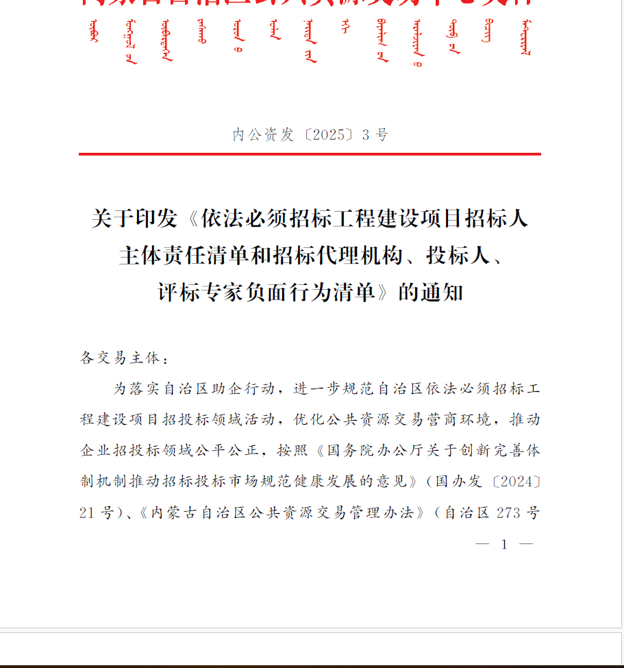 内蒙古自治区公共资源交易中心关于印发《依法必须招标工程建设项目招标人主体责任清单和招标代理机构、投标人、评标专家负面行为清单》的通知