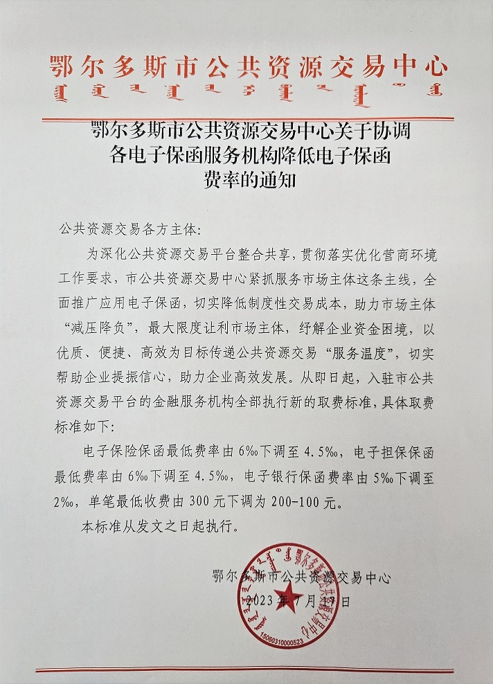 鄂尔多斯市公共资源交易中心关于协调各电子保函服务机构降低电子保函费率的通知
