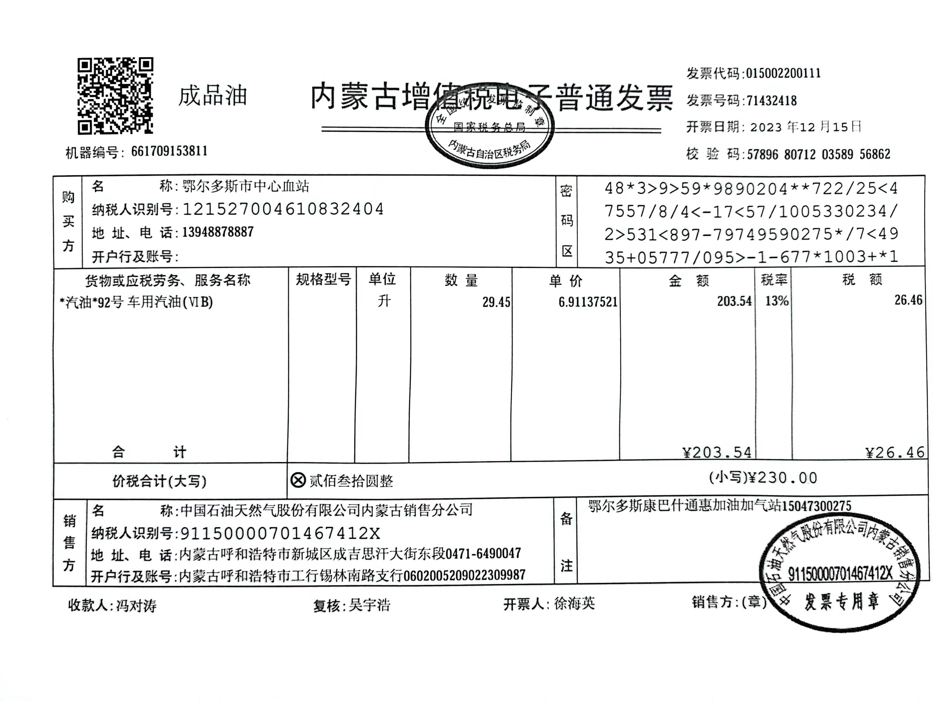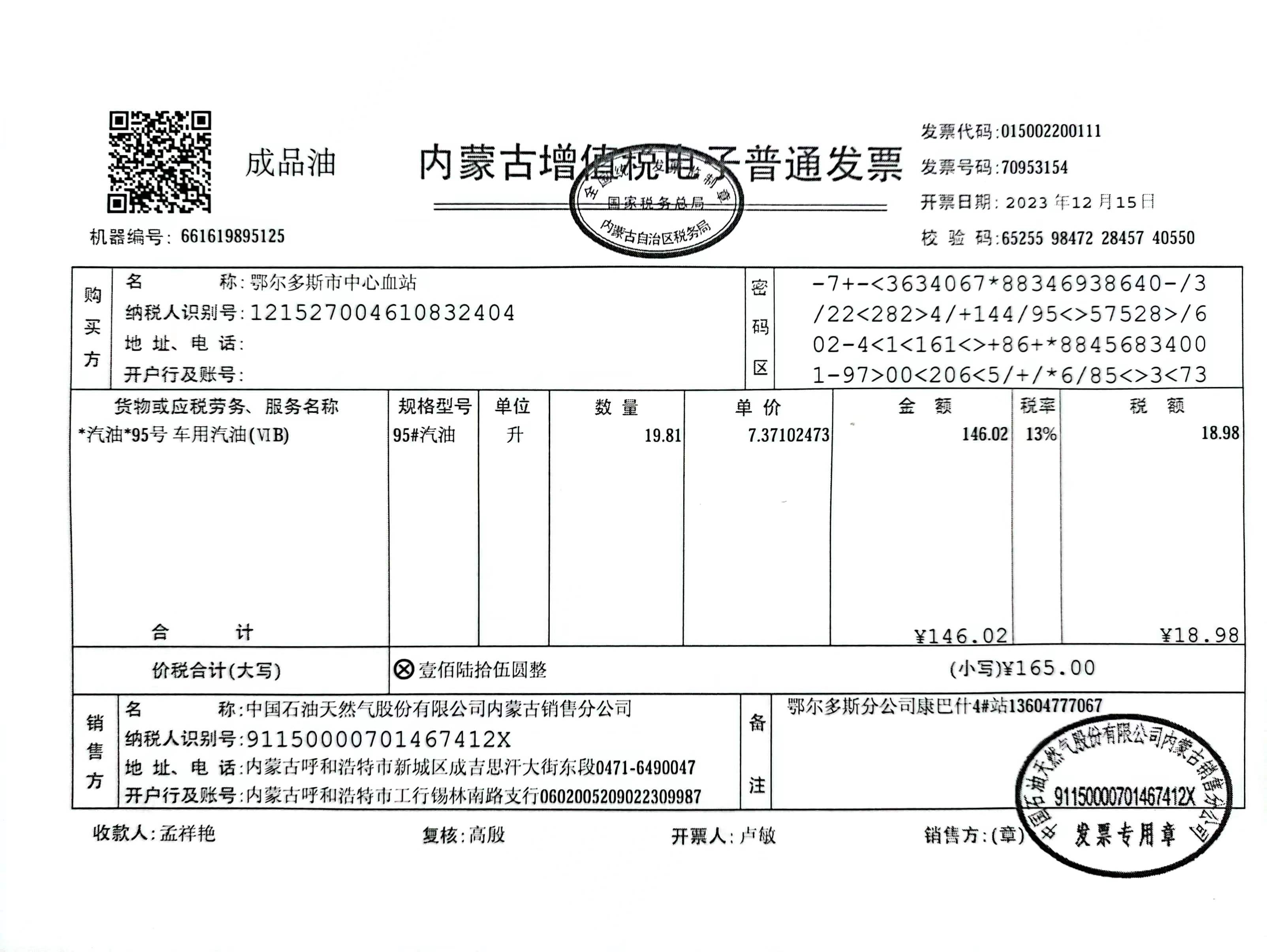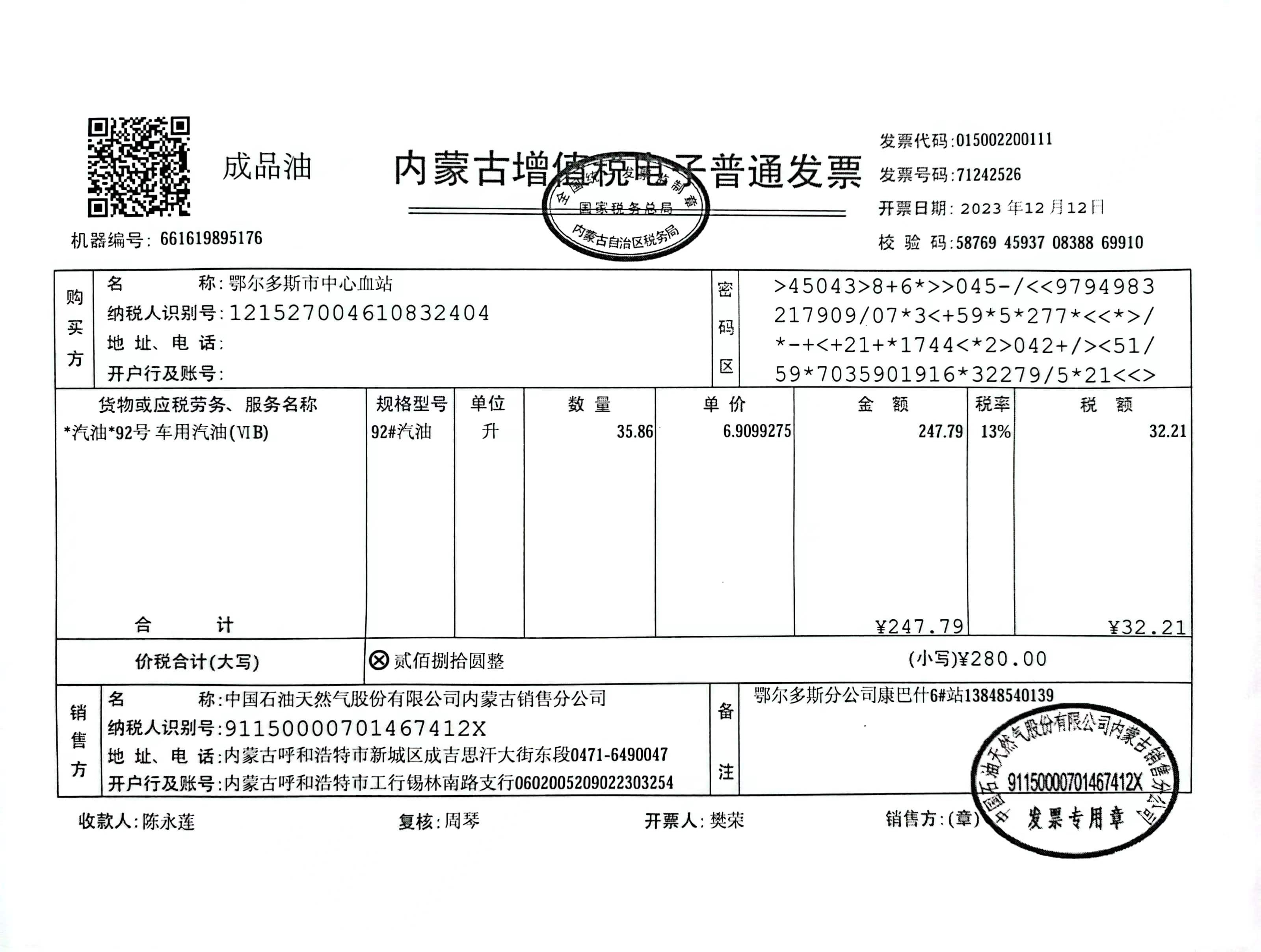 四、项目名称:鄂尔多斯市中心血站2023年12月份车辆加油费用