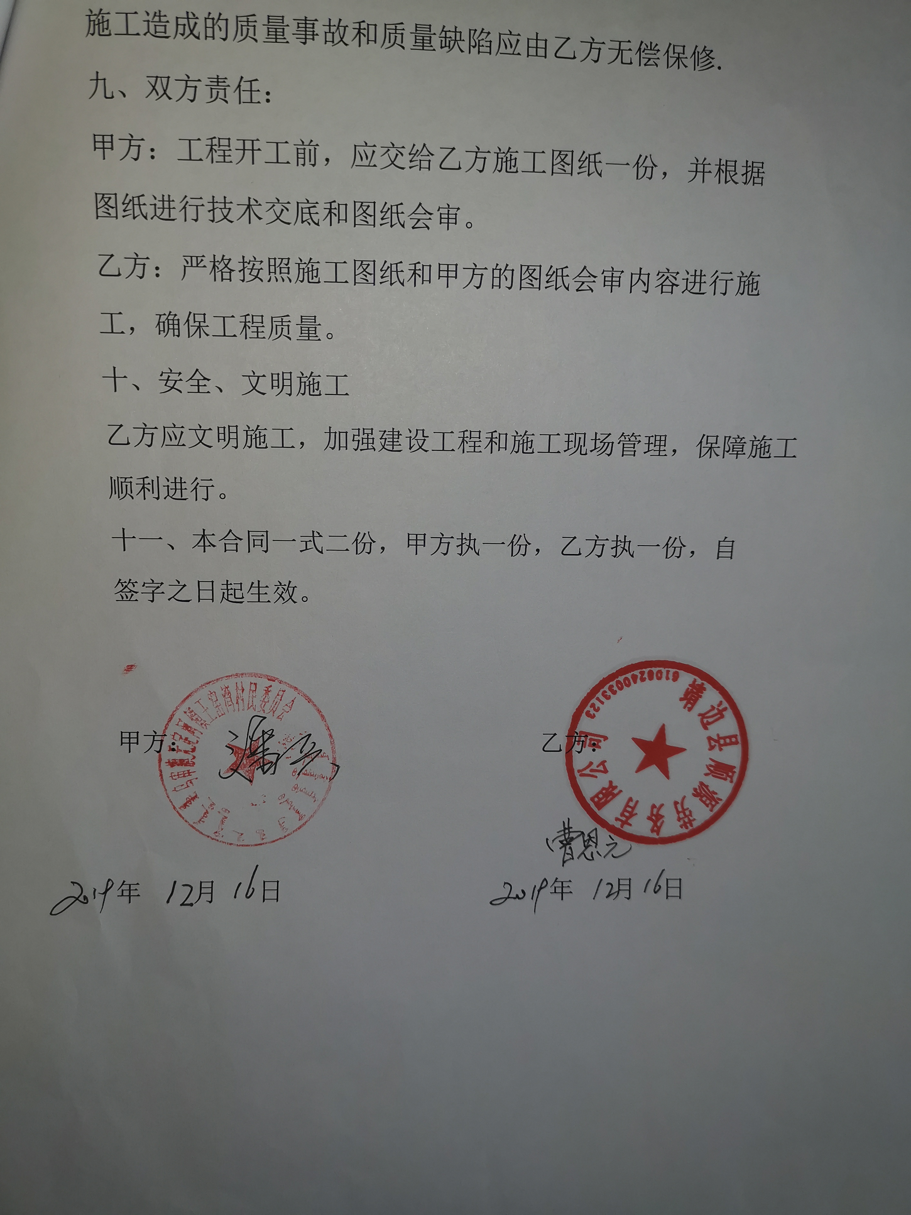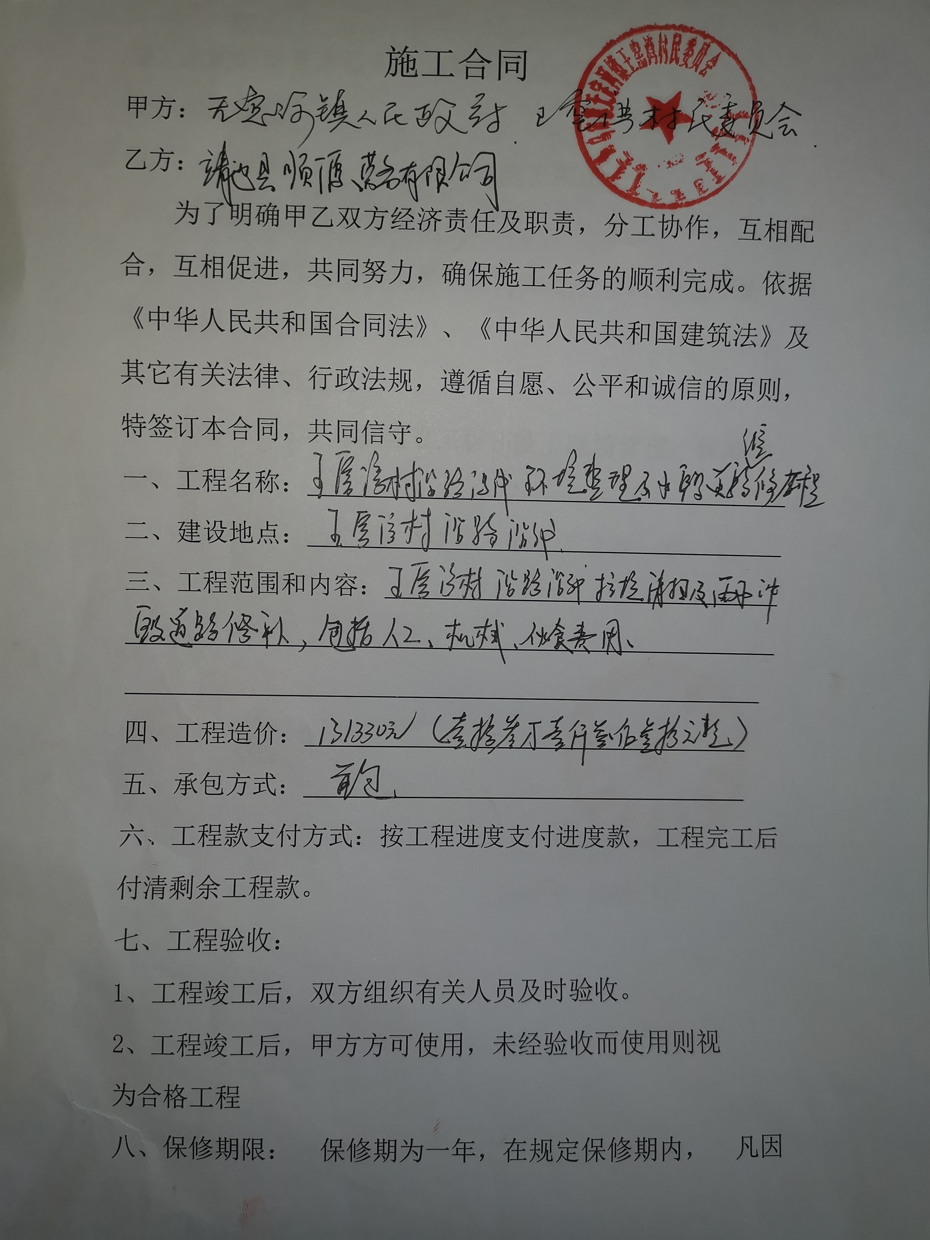 合同名称:王窑湾村沿路沿线环境整理及水毁道路维修施工合同