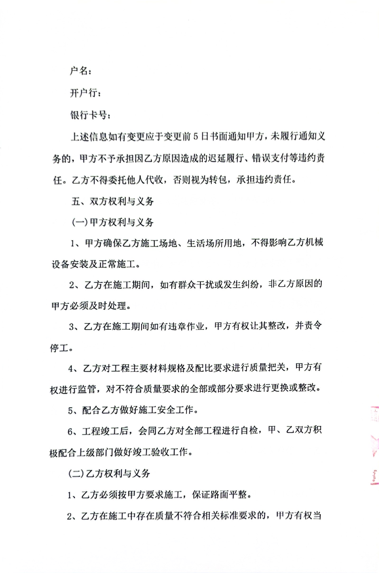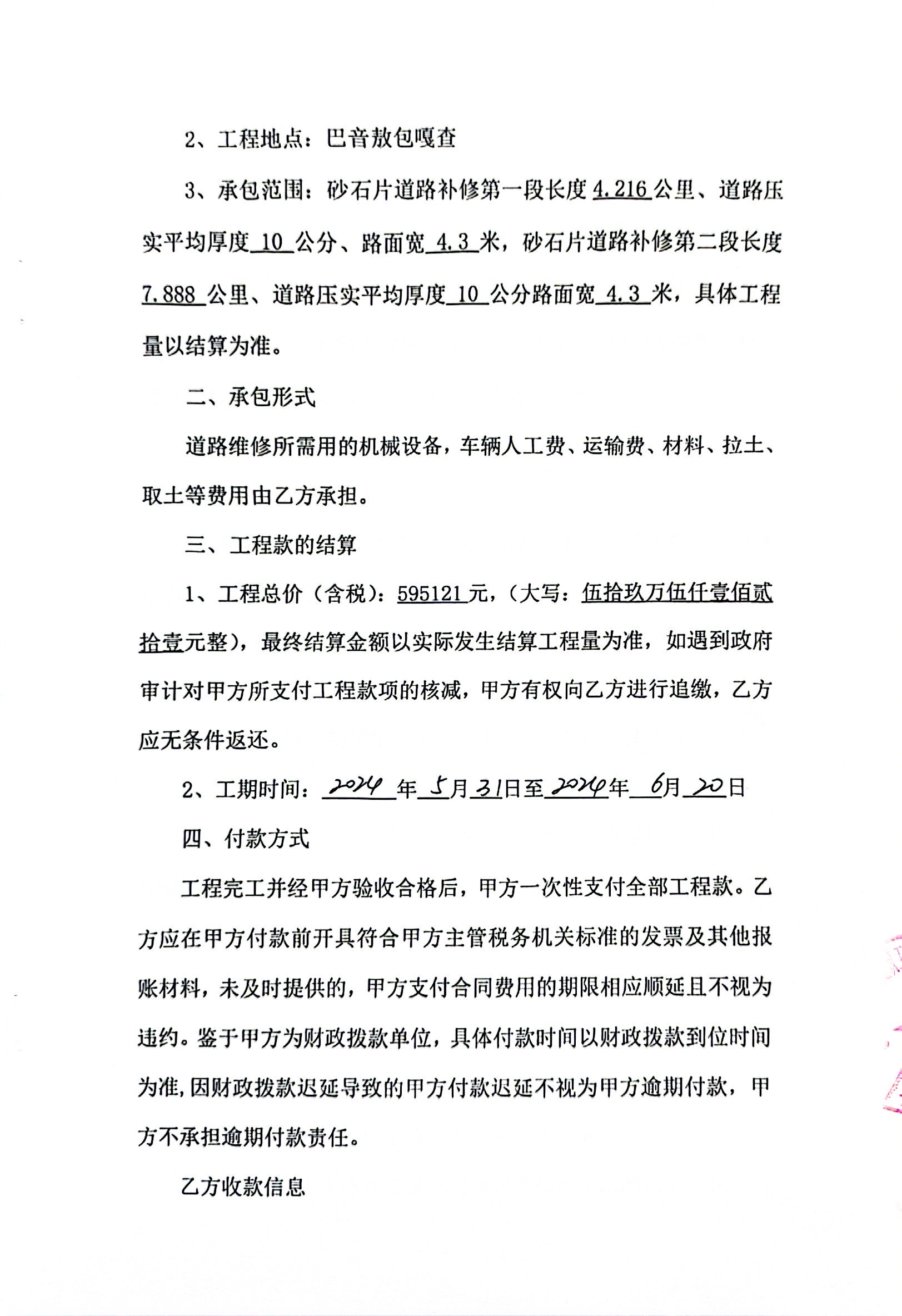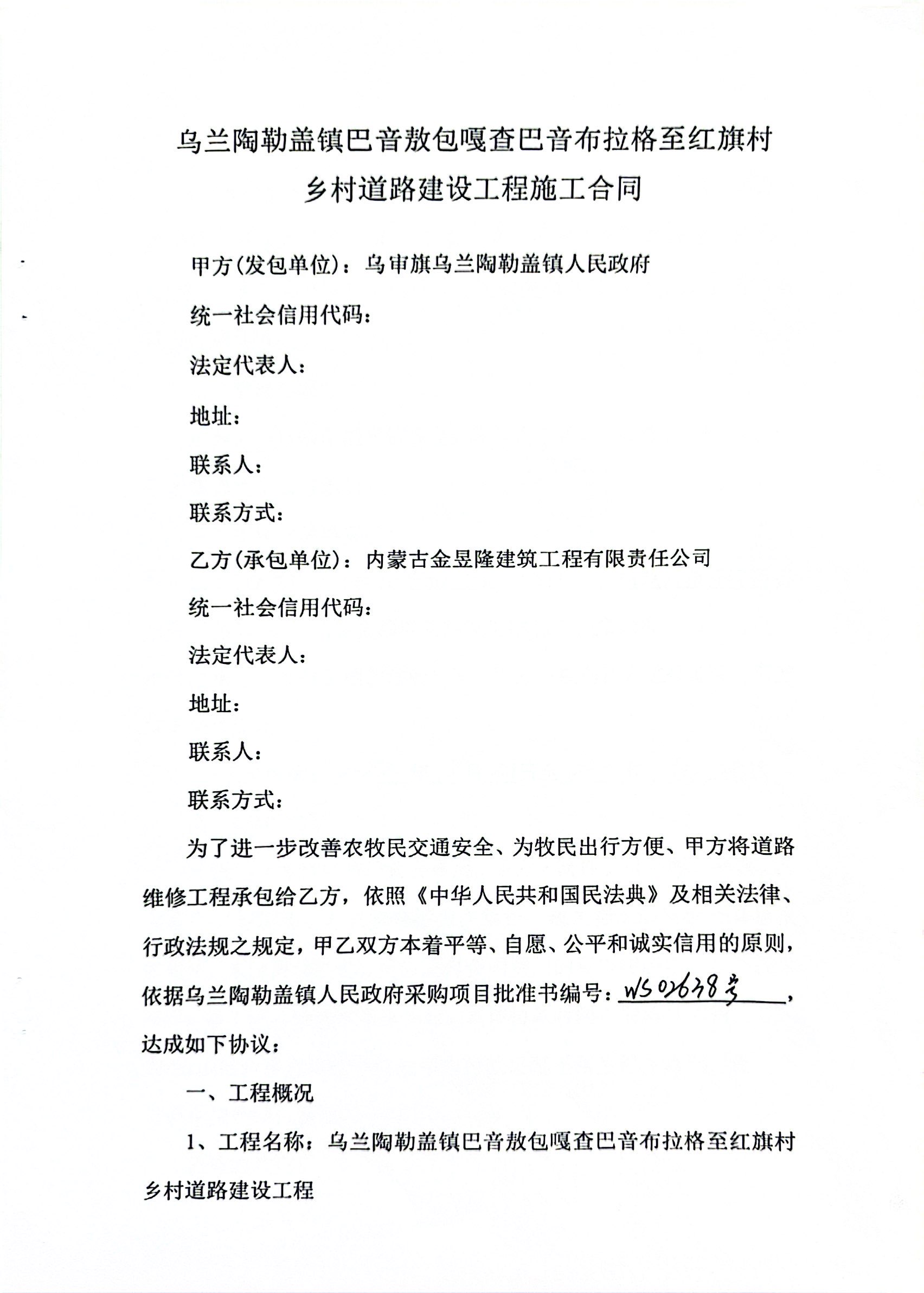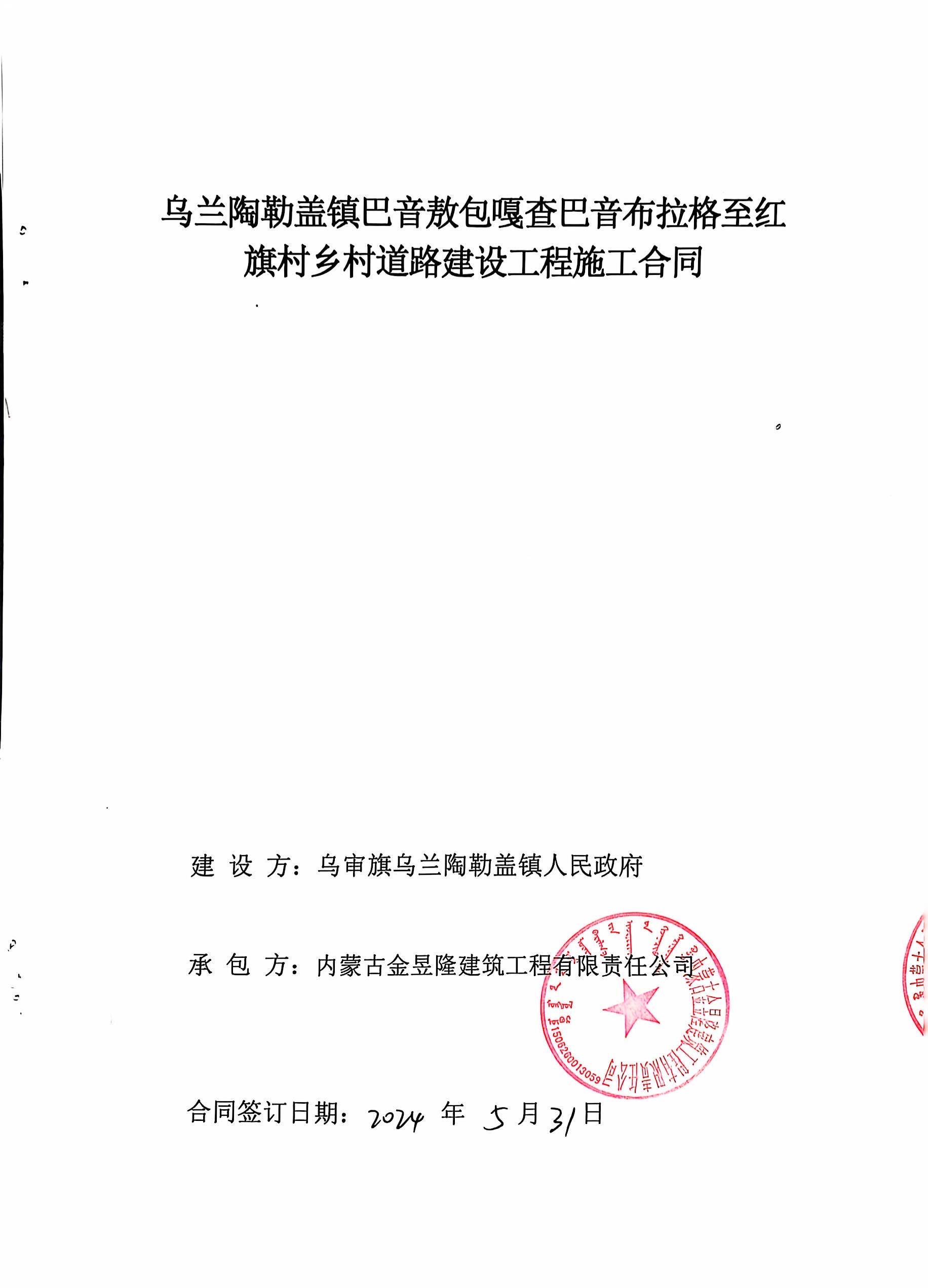 二、合同名称:乌兰陶勒盖镇巴音敖包嘎查巴音布拉格至红旗村乡村道路艰涩工程施工合同