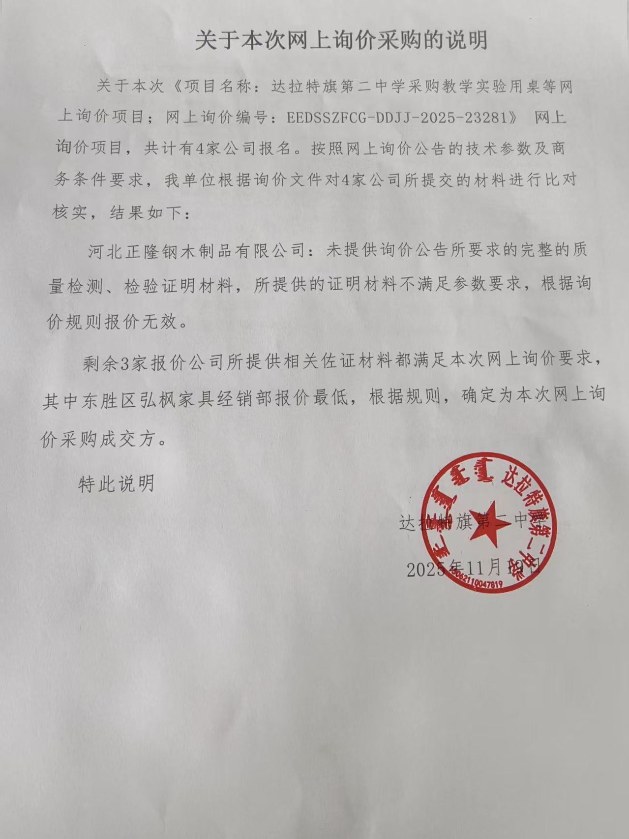 项目名称:达拉特旗第二中学采购教学实验用桌等网上询价项目