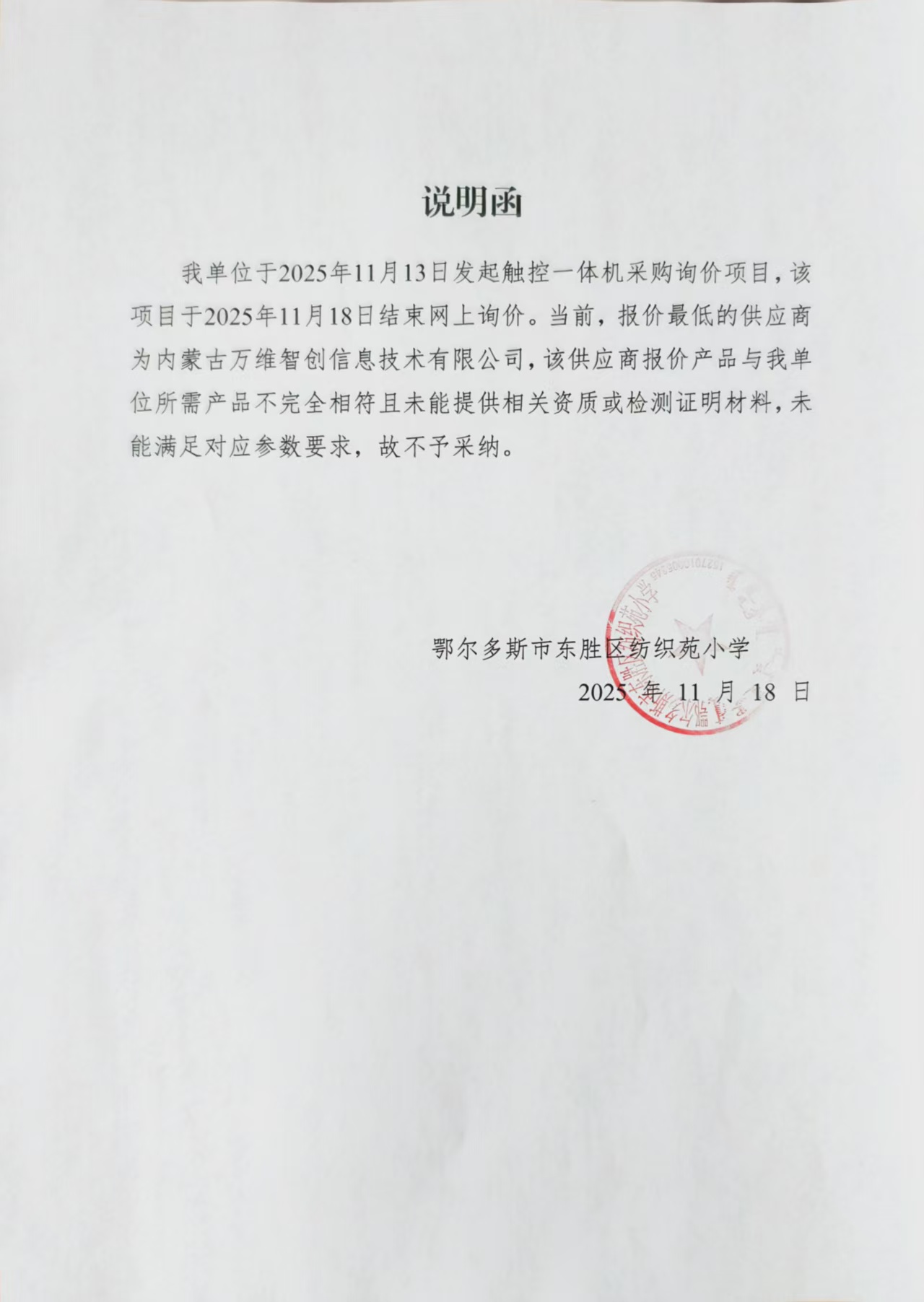 项目名称:鄂尔多斯市东胜区纺织苑小学采购触控一体机网上询价项目