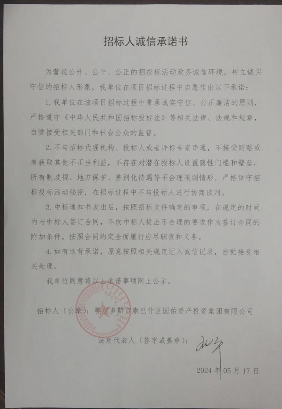 招 标 人(章): | 鄂尔多斯市康巴什区国佑资产投资集团有限公司 | 招标代理机构(章): | 内蒙古诚亦信项目管理咨询有限公司 |