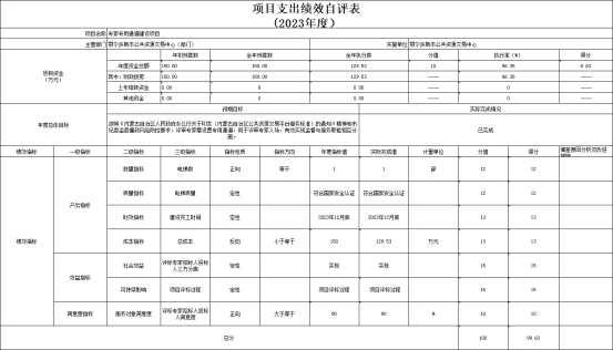 4.专家专用通道建设项目自评综述:根据年初设定的绩效目标,项目自评得分98.63分,扣分原因是预算执行率未达100%。全年预算数为150万元,执行数为129.53万元,完成预算的86.35%。项目绩效目标完成情况:已按照《内蒙古自治区人民政府办公厅关于印发(内蒙古自治区公共资源交易平台服务标准)的通知》精神和市纪委监委廉政风险防控要求,评审专家设置专用通道,用于评审专家入场,有效实现监督与服务职能相互分离。项目绩效完成情况:1、数量指标。1)电梯数,目标值等于1部,实际完成1部,分值12,得分 12。2、质量指标。2)电梯质量,目标值符合国家安全认证,实际完成符合国家安全认证,分值12,得分 12。3、时效指标。3)建设完工时间,目标值2023年12月底,实际完成2023年12月底,分值13,得分13。发现的主要问题及原因:按照合同要求本项目分三期付款,第一期付50%,第二期付40%,第三期付10%。按照合同进度,余10%因消防未完成验收没有支付。下一步改进措施:按照合同进度支付。