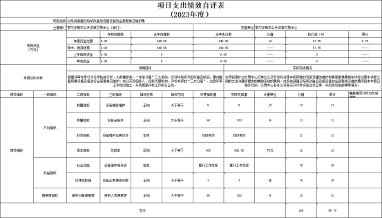 2.对系统新建及场所改造后设施设备的全新更换及维护费项目自评综述:根据年初设定的绩效目标,项目自评得分99.79分,扣分原因是预算执行率未达100%。全年预算数为248万元,执行数为242.92万元,完成预算的97.95%。项目绩效目标完成情况:本项目是针对交易中心日常办公及开评标过程中所损耗的设备设施的维护和更新更换费用和评标过程中评委之间的交流沟通所提供的辅助系统的费用。对系统新建及场所改造后设施设备的全新更换及维护费项目本年度已服务完成,交易中心各办公设备及开评标设备运行正常,未出现设备故障等情况。项目绩效完成情况1、数量指标。1设备维修维护,目标值大于等于5次,实际完成5次,分值13,得分13。2、质量指标2设备合格率,目标值大于等于98%,实际完成100%,分值13,得分13。3、时效指标。3设备维护运转时效,目标值及时有效,实际完成及时有效,分值12,得分12。发现的主要问题及原因:需进一步提高解决系统运行过程中出现的问题的效率。下一步改进措施:设备运行过程中出现的问题能够及时进行解决,确保交易工作的正常运行;服务对象范围主要包括鄂尔多斯市本级及各招投标主体。