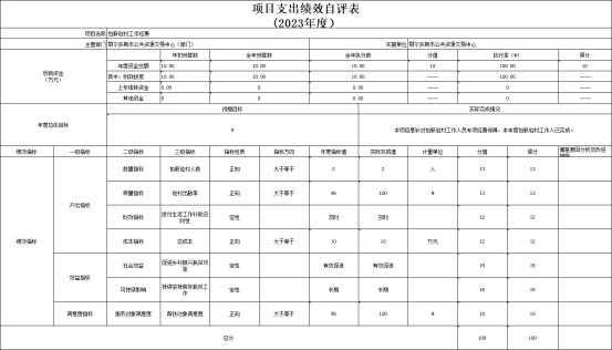 4.专家专用通道建设项目自评综述:根据年初设定的绩效目标,项目自评得分98.63分,扣分原因是预算执行率未达100%。全年预算数为150万元,执行数为129.53万元,完成预算的86.35%。项目绩效目标完成情况:已按照《内蒙古自治区人民政府办公厅关于印发(内蒙古自治区公共资源交易平台服务标准)的通知》精神和市纪委监委廉政风险防控要求,评审专家设置专用通道,用于评审专家入场,有效实现监督与服务职能相互分离。项目绩效完成情况:1、数量指标。1)电梯数,目标值等于1部,实际完成1部,分值12,得分 12。2、质量指标。2)电梯质量,目标值符合国家安全认证,实际完成符合国家安全认证,分值12,得分 12。3、时效指标。3)建设完工时间,目标值2023年12月底,实际完成2023年12月底,分值13,得分13。发现的主要问题及原因:按照合同要求本项目分三期付款,第一期付50%,第二期付40%,第三期付10%。按照合同进度,余10%因消防未完成验收没有支付。下一步改进措施:按照合同进度支付。