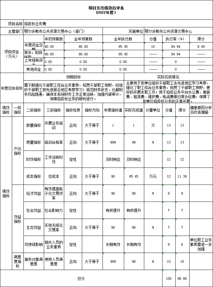 1招投标业务费项目自评综述:根据年初设定的绩效目标,项目自评得分96.88 分。全年预算数为90 万元,执行数为85.45万元,完成预算的94.94 %。项目绩效目标完成情况:主要用于我单位组织干部职工去先进地区学习考察,强化了职工综合业务素质,拓宽了干部职工视野,更好的开展本职工作;用于招投业务平台办公费、差旅费、租赁费、维护费、电话费等日常办经费,保障了我单位招投标业务的正常开展。发现的主要问题及原因:单位职工业务素质需进一步加强。下一步改进措施:加强学习考察,提高单位职工业务素质