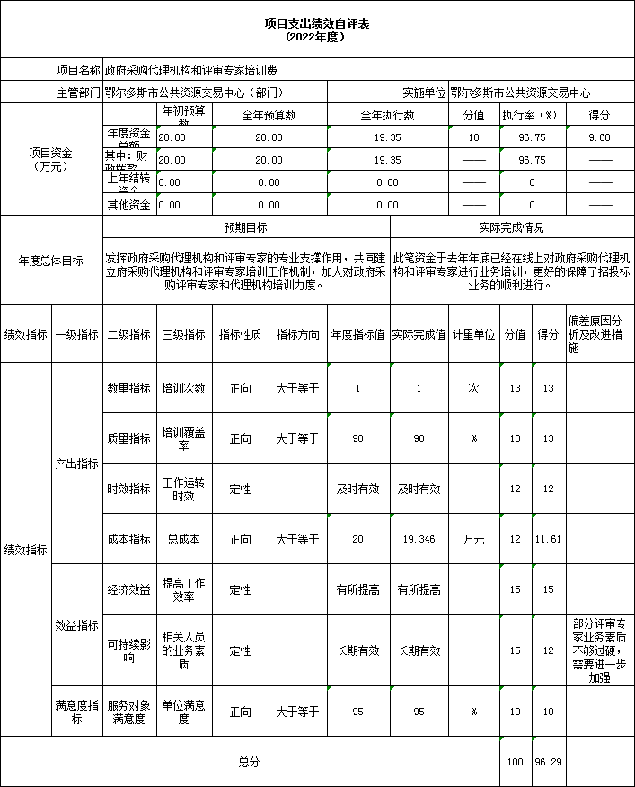 2政府采购代理机构和评审专家培训费项目自评综述:根据年初设定的绩效目标,项目自评得分96.29分。全年预算数为20 万元,执行数为19.35万元,完成预算的96.75 %。项目绩效目标完成情况:此笔资金于去年年底已经在线上对政府采购代理机构和评审专家进行业务培训,更好的保障了招投标业务的顺利进行。发现的主要问题及原因:部分评审专家业务素质不够过硬,需要进一步加强。下一步改进措施:加强对政府采购代理机构和评审专家的业务培训,提高评审专家业务素质