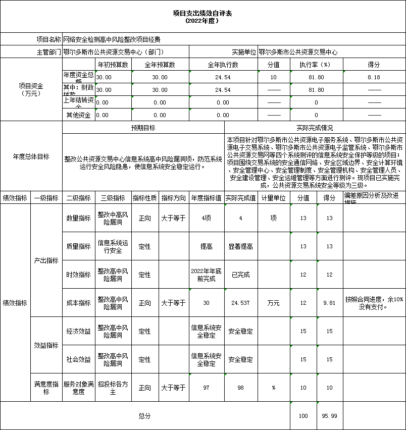 3网络安全检测高中风险整改项目经费项目自评综述:根据年初设定的绩效目标,项目自评得分95.99分。全年预算数为30 万元,执行数为24.54万元,完成预算的81.80%。项目绩效目标完成情况:本项目针对鄂尔多斯市公共资源电子服务系统、鄂尔多斯市公共资源电子交易系统、鄂尔多斯市公共资源电子监管系统、鄂尔多斯市公共资源交易网等四个系统测评的信息系统安全保护等级的项目;项目围绕交易系统的安全通信网络、安全区域边界、安全计算环境、安全管理中心、安全管理制度、安全管理机构、安全管理人员、安全建设管理、安全运维管理等方面进行测评。现项目已实施完成,公共资源交易系统安全等级为三级。发现的主要问题及原因:按照合同进度,余10%没有支付。下一步改进措施:按照合同进度支付