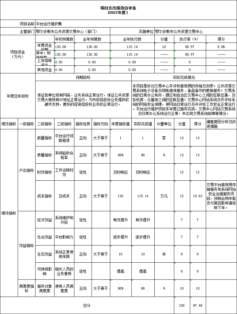 5平台运行维护费项目自评综述:根据年初设定的绩效目标,项目自评得分97.49 分。全年预算数为130 万元,执行数为115.14万元,完成预算的88.57 %。项目绩效目标完成情况:本项目是针对交易中心开评标音视频的存储及刻录;公共资源交易系统电子设备及弱电维保服务、备品备件的更换服务;交易系统的日常办公和市、旗区和自治区交易中心之间的互联互通,及各机房、云基地之间的互联互通;交易中心网站系统及开评标系统的网络安全保障,使网站日常运行及开评标工作安全正常运行。平台运行维护项目本年度已服务完成,交易中心网站交易系统及日常办公系统运行正常,未出现交易系统故障等情况。发现的主要问题及原因:交易平台音视频存储服务和系统网站安全运维服务项目,按照合同未能支付第四款申请结转下年。下一步改进措施:按照合同进度支付