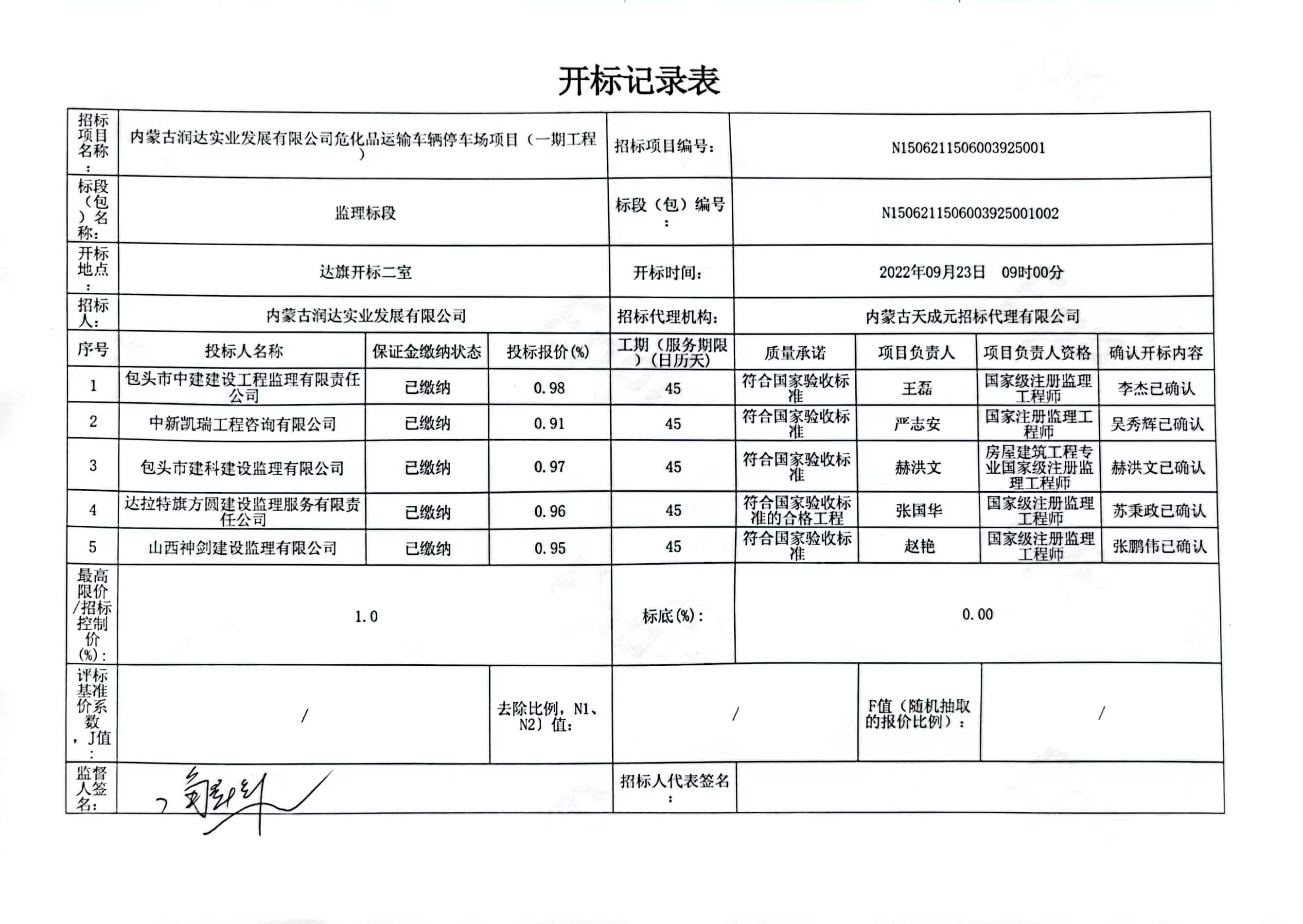 内蒙古润达实业发展有限公司危化品运输车辆停车场项目(一期工程)监理标段中标候选人公示 |