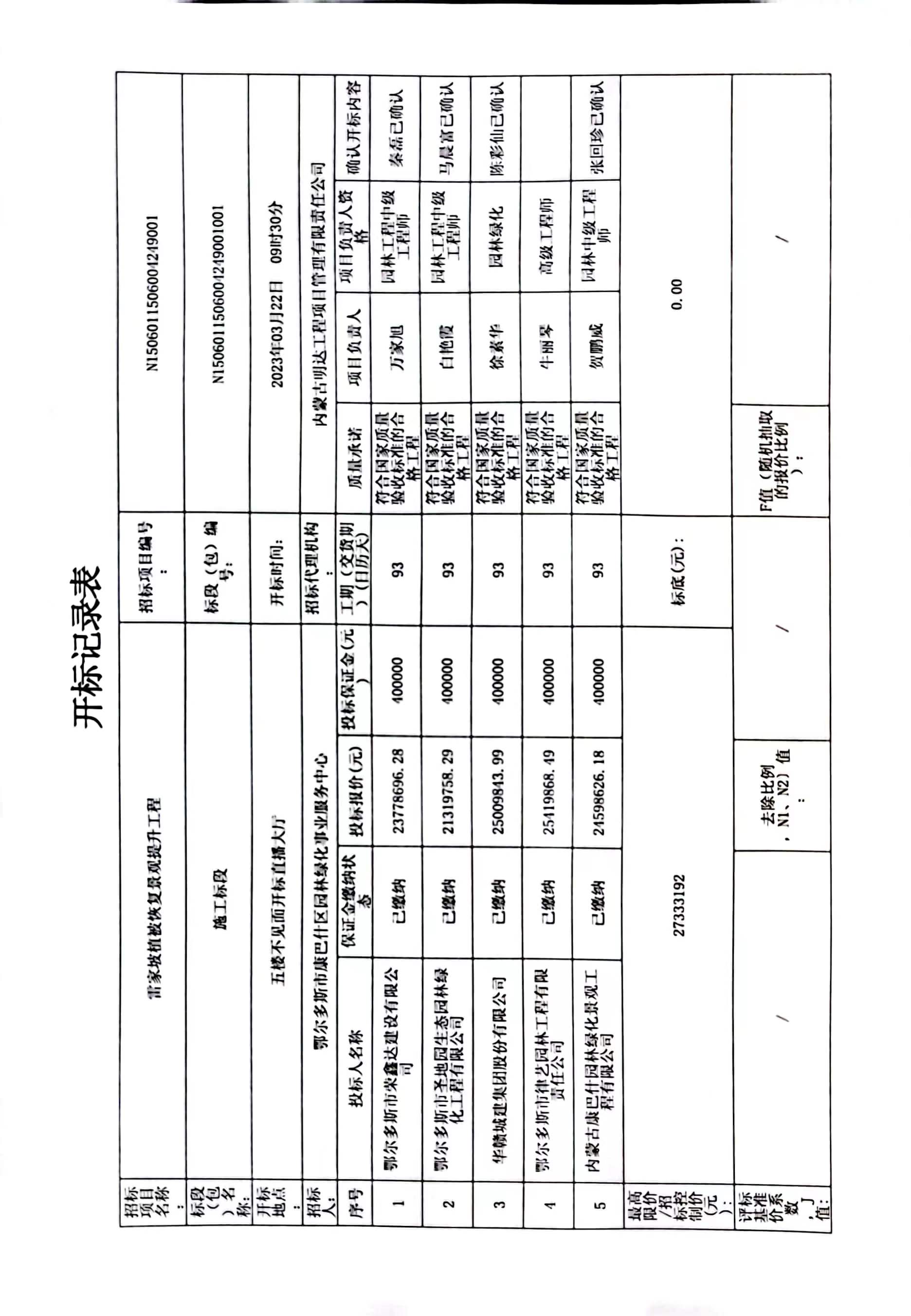 2 | 鄂尔多斯市律艺园林工程有限责任公司 | 已标价工程量清单封皮签字盖章不齐全 | 根据评标办法第三章2.1.4条响应性评审标准中已标价工程量清单要求,投标文件中已标价工程量清单应签字、盖章齐全并符合招标文件要求。 |