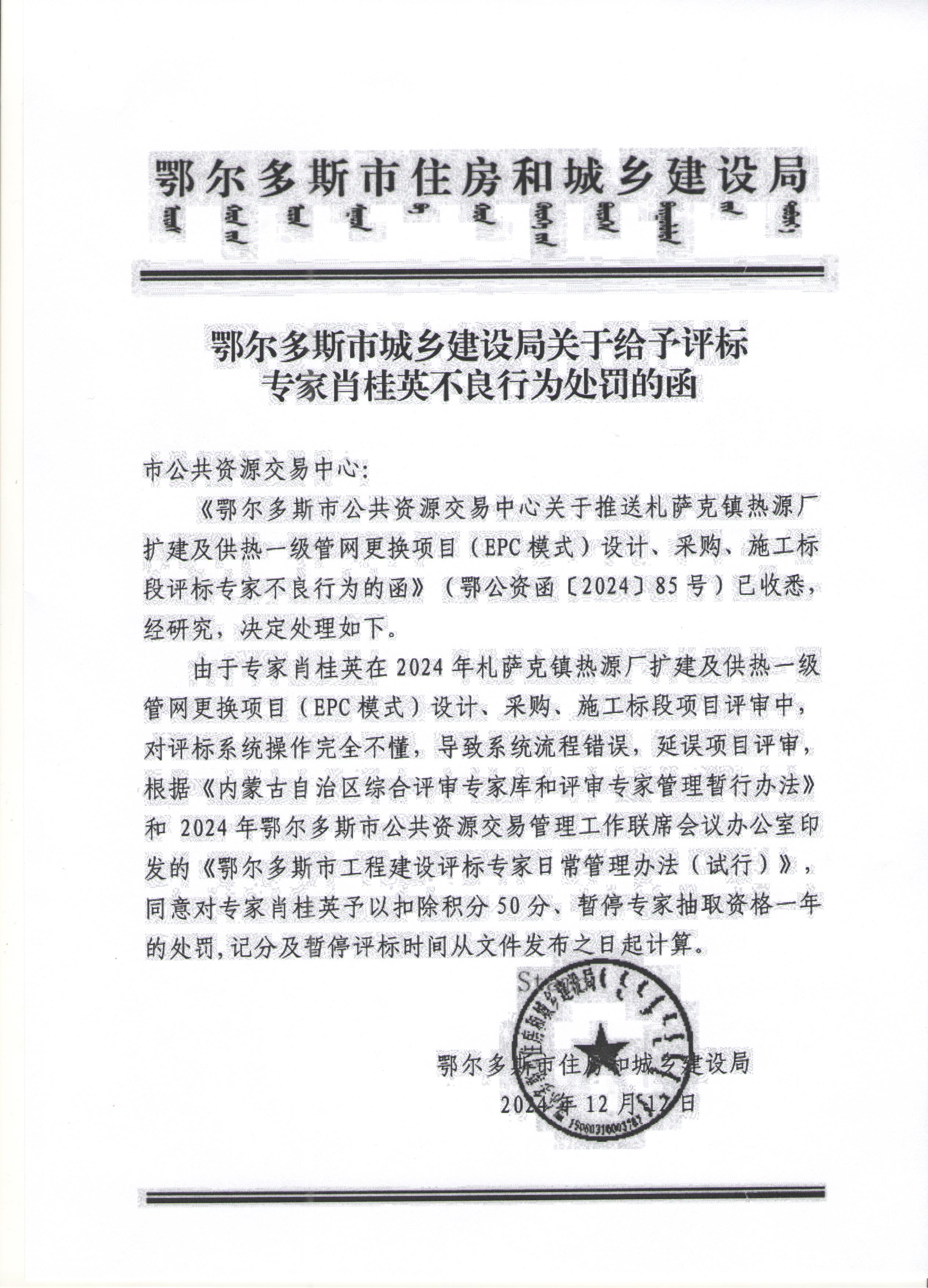 鄂尔多斯市住房和城乡建设局关于给予评标专家肖桂英不良行为处罚结果的通报
