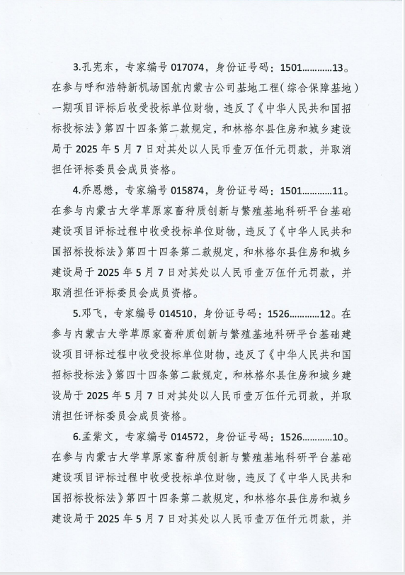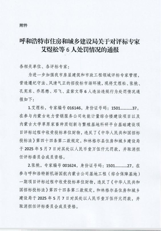 关于转发《呼和浩特市住房和城乡建设局关于对评标专家艾煜松等6人处罚情况的通报》的通知