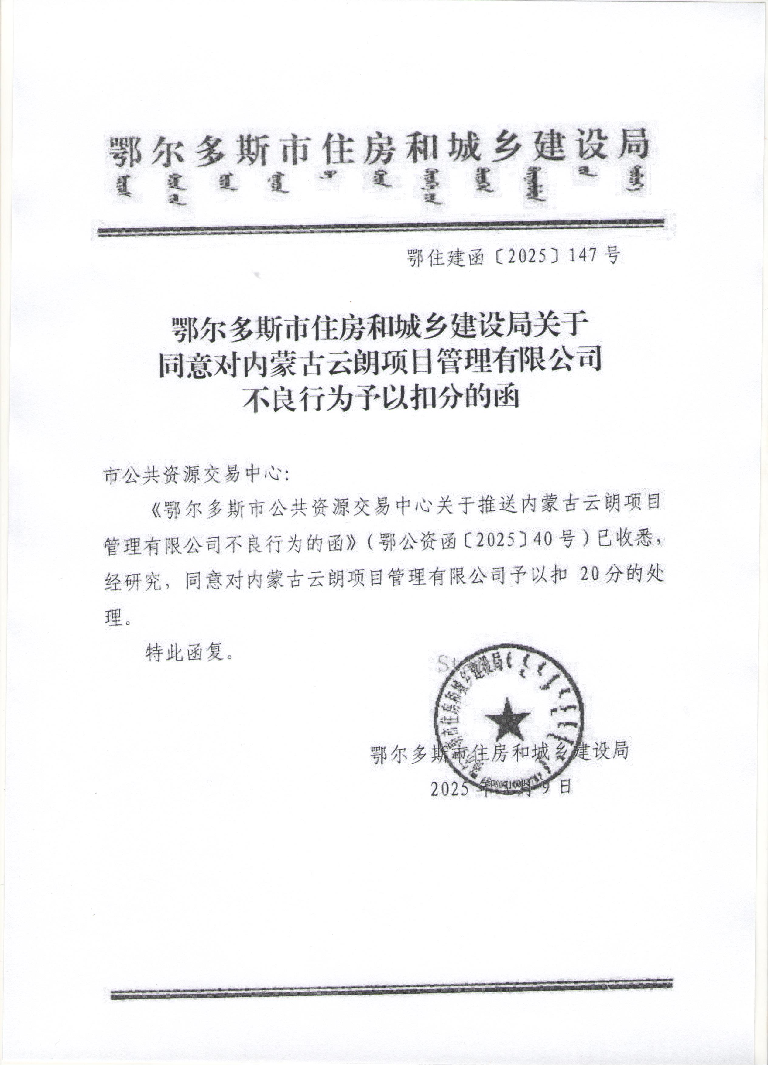 鄂尔多斯市住房和城乡建设局关于对内蒙古云朗项目管理有限公司不良行为处罚的通报