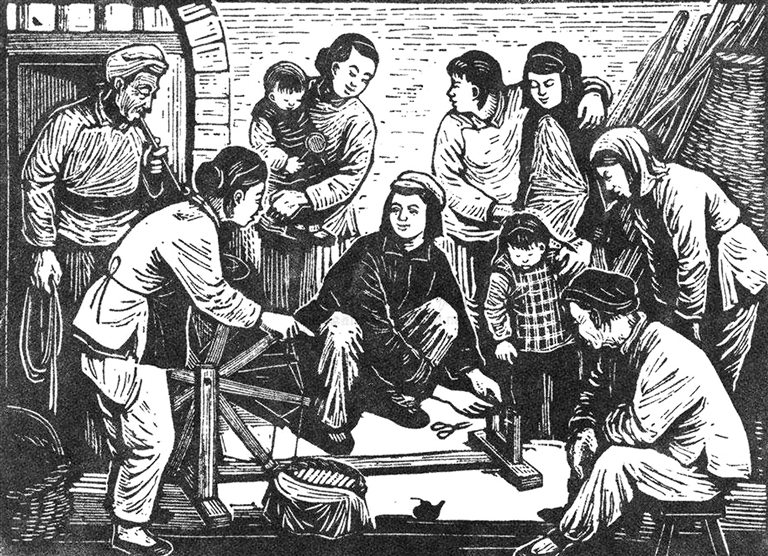 图为画家力群创作的反映大生产运动的版画《帮群众修理纺车》。(资料图片)