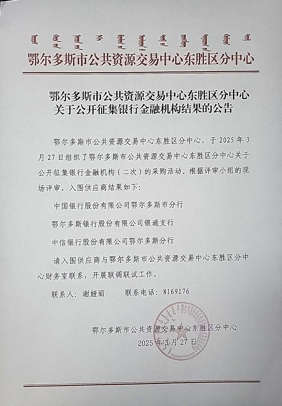 鄂尔多斯市公共资源交易中心东胜区分中心关于公开征集银行金融机构结果的公告