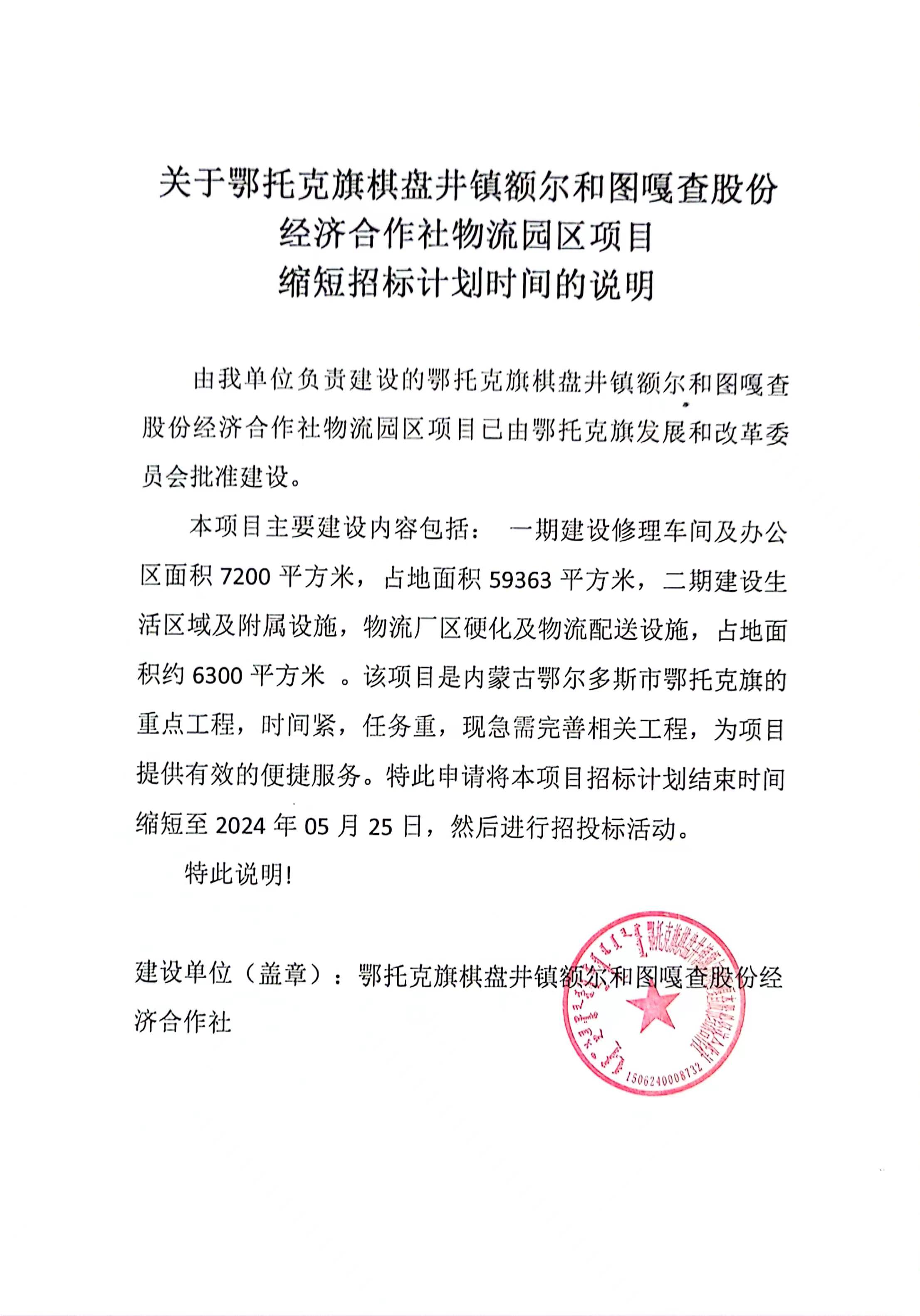 鄂托克旗棋盘井镇额尔和图嘎查股份经济合作社物流园区项目项目招标计划