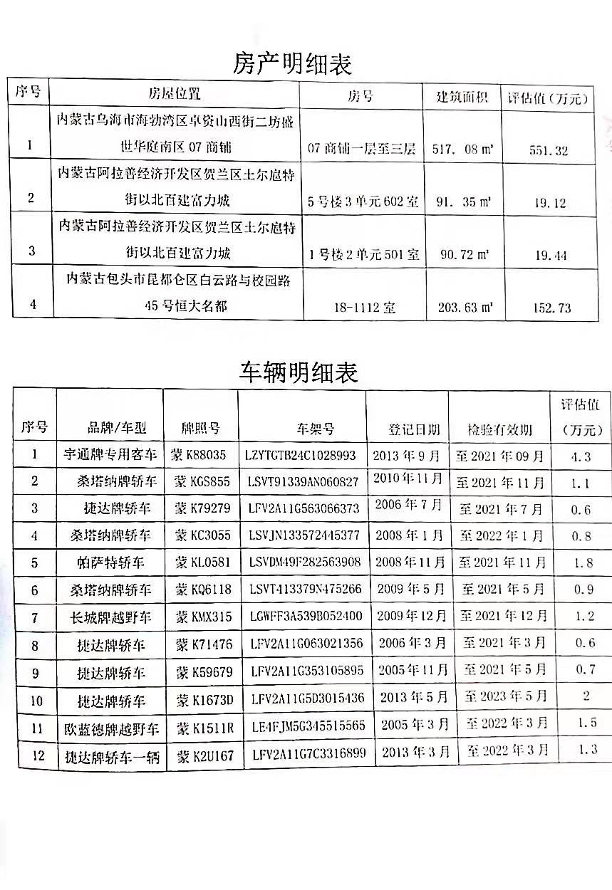 6、蒙KMX315长城牌越野车一辆,车架号LGWFF3A539B052400,登记日期2009年12月,检验有效期至2021年12月,参考价7910元;