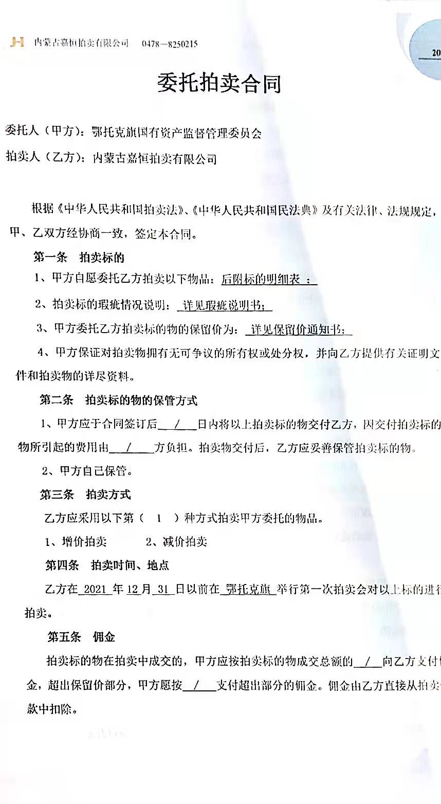 接受委托,我公司定于2022年4月8日上午9时整,在内蒙古鄂尔多斯市公共资源交易网鄂托克旗分中心网站(http://www.ordosggzyjy.org.cn)公开拍卖以下标的:
