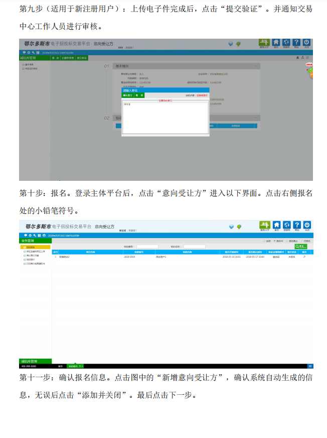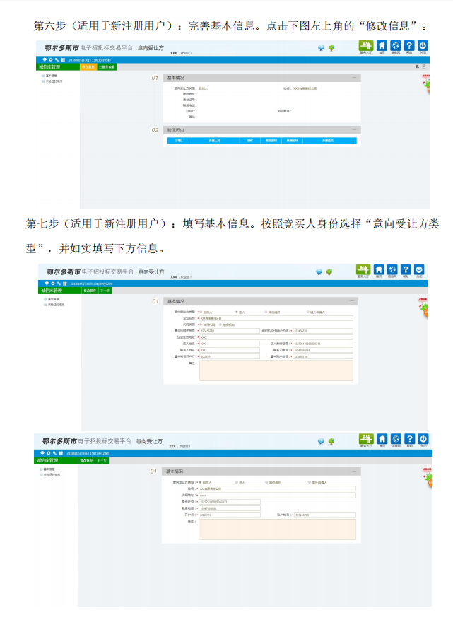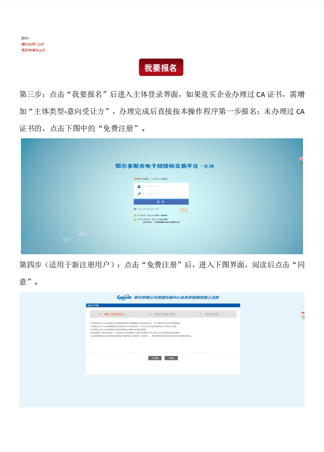 二、报名须知:如果竞买企业办理过CA证书,需增加“主体类型-意向受让方”,并完善基本信息;未办理过CA证书的,在鄂尔多斯市公共资源交易网的主体登录专区进行“免费注册”,并完善基本信息,并办理CA证书。(详细操作程序参考公告中的附件)