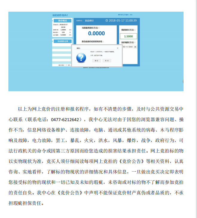 四、拍卖规则:本次拍卖为延时竞价时间。拍卖会开始时间按竞价方式逐项逐步进行,进入延时竞价时间中每当有新的最高报价出现时,延时竞价时间将重新开始计算,直至延时竞价时间结束后场中再无新的报价,且最高出价达到或超过底价,最高出价将自动成交,最高出的竞买人即成为买受人。加价幅度网络拍卖自动生成。竞买人出价最高且达到或超过保留价的竞买人即成为拍卖标的的买受人,买受人拍卖会后2日内必须到拍卖人处签署《网络拍卖成交确认书》。