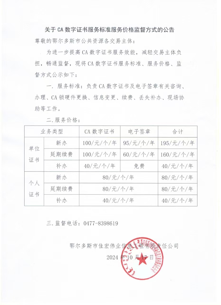为进一步提高CA数字证书服务效能,减轻交易主体负担,畅通监督,现将CA数字证书服务标准、服务价格、监督方式公示如下: