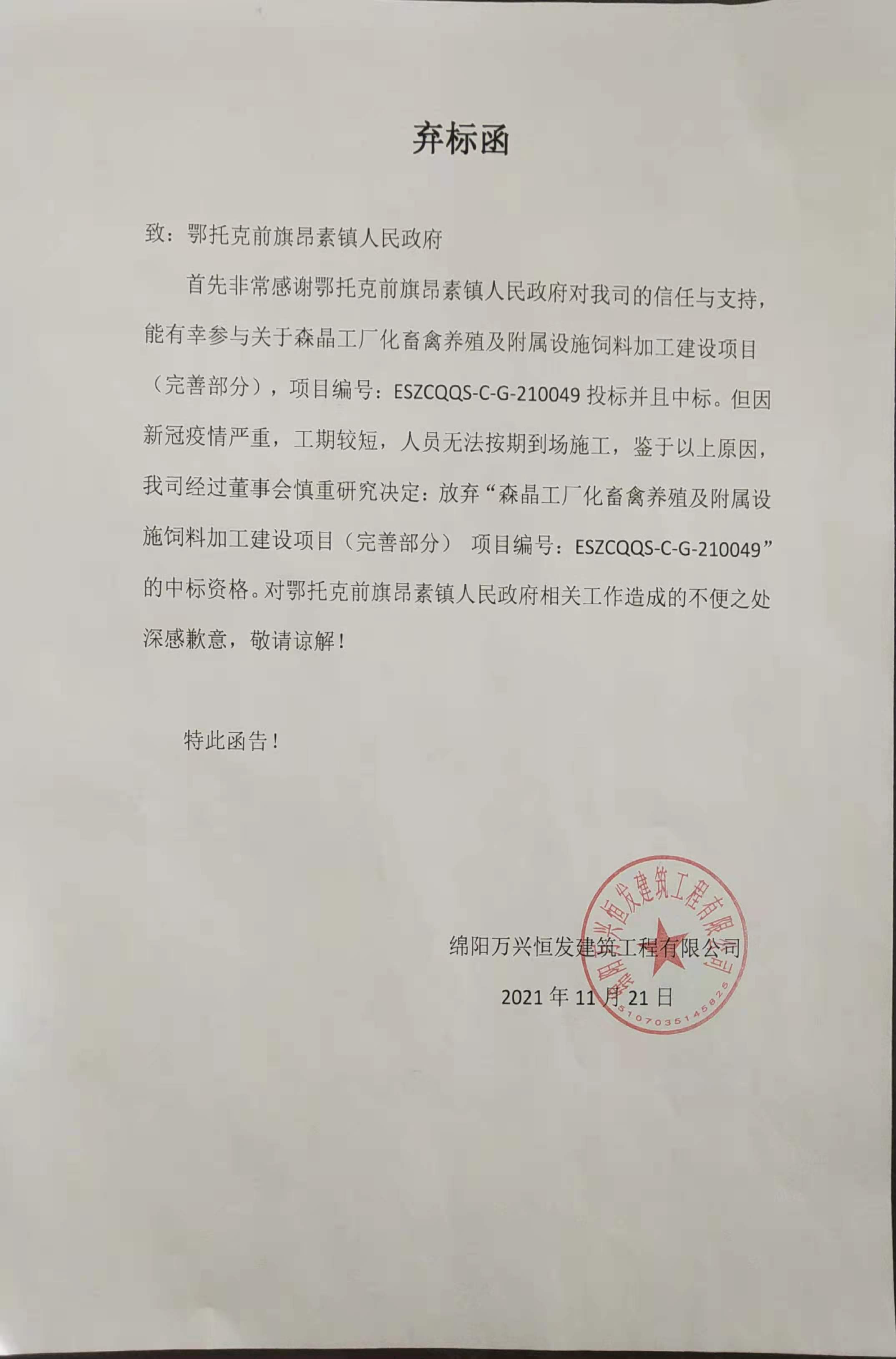 原公告的合同包1( 森晶工厂化畜禽养殖及附属设施饲料加工建设项目(完善部分))中标供应商(第1候选人):绵阳万兴恒发建筑工程有限公司,更正为:陕西国坤建设工程有限公司。