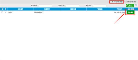 1、在项目管理页面,选择“今日开标项目”状态,可以看见当天开标的项目,点击“进入项目”按钮,进入评标页面。如下图: