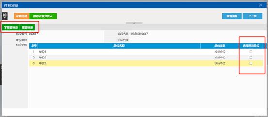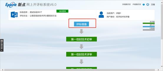 1、点击页面流程中的“评标准备按钮”,进入评标准备环节,依次进行评委回避、招标文件评价、推荐评委主任环节。如下图: