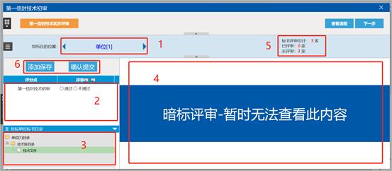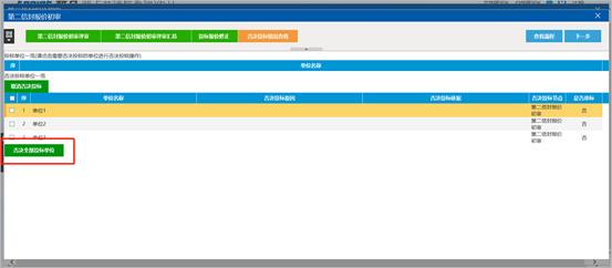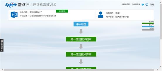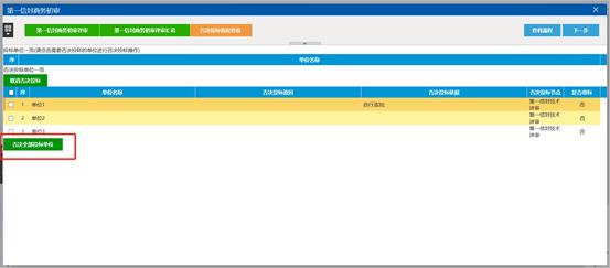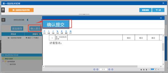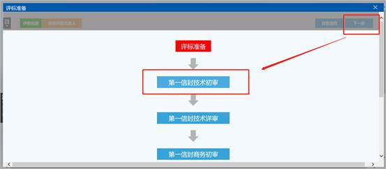 1、评委负责人推荐完成后,点击“下一步”按钮,在弹出的流程树中点击“第一信封技术初步评审”按钮进入第一信封技术初步评审环节。如下图: