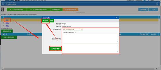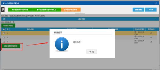 3、若所有投标单位均被否决投标,点击“否决全部投标单位”确认本次招标项目流标。如下图: