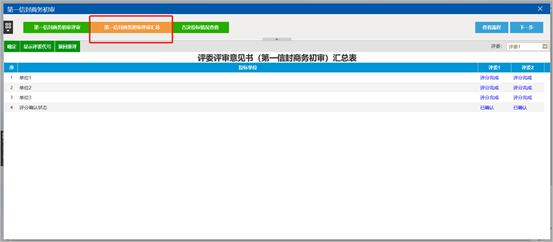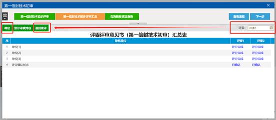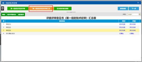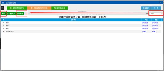 2、评审组长确认各评委评审意见无误后,点击“确认”完成汇总。若不同意某评委评审意见,可选择该评委,点击“退回重评”,要求该评委重新进行第一信封商务初步评审。如下图: