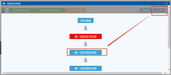 1、第一信封技术评审完成后,点击“下一步”按钮,在弹出的流程树中点击“第一信封商务初审”按钮进入第一信封商务初步评审环节。如下图: