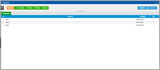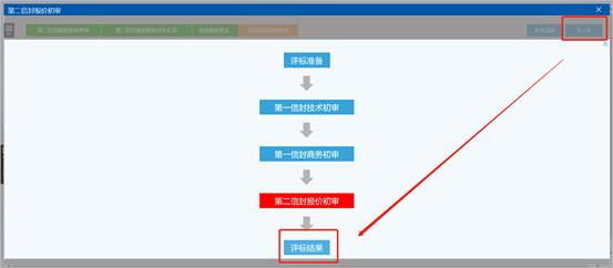 1、第二信封报价评审完成后,点击“下一步”按钮,在弹出的流程树中点击“评标结果”按钮进入评标结果环节。如下图: