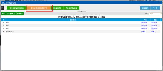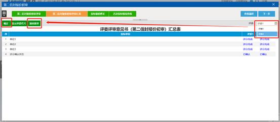2、评审组长确认各评委评审意见无误后,点击“确认”完成汇总。若不同意某评委评审意见,可选择该评委,点击“退回重评”,要求该评委重新进行第二信封报价初步评审。如下图: