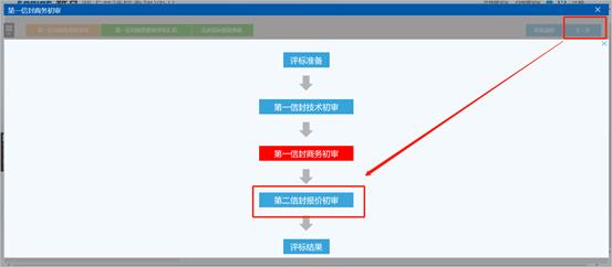 1、第一信封商务评审完成后,待开标管理员完成第一信封所有评审结果汇总且第二信封开标结束后,点击“下一步”按钮,在弹出的流程树中点击“第二信封报价初审”按钮进入第二信封报价初审环节。如下图: