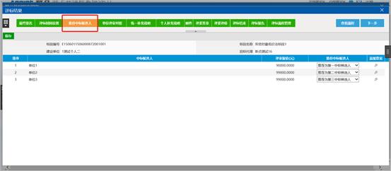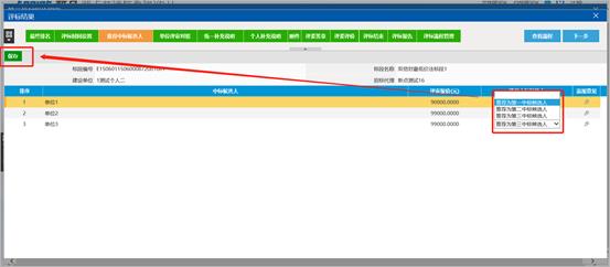 3、点击下拉框按钮,根据实际情况进行中标候选人的调整,调整完毕后点击左上角“保存”按钮。如下图: