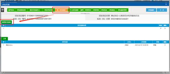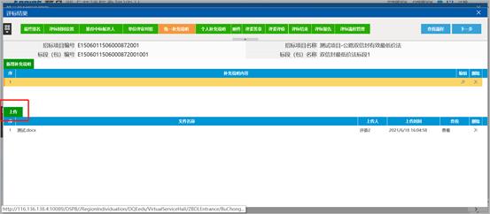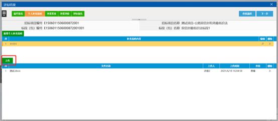 1、点击“附件”子菜单,在页面点击“上传”可进行评标附件的上传。如下图: